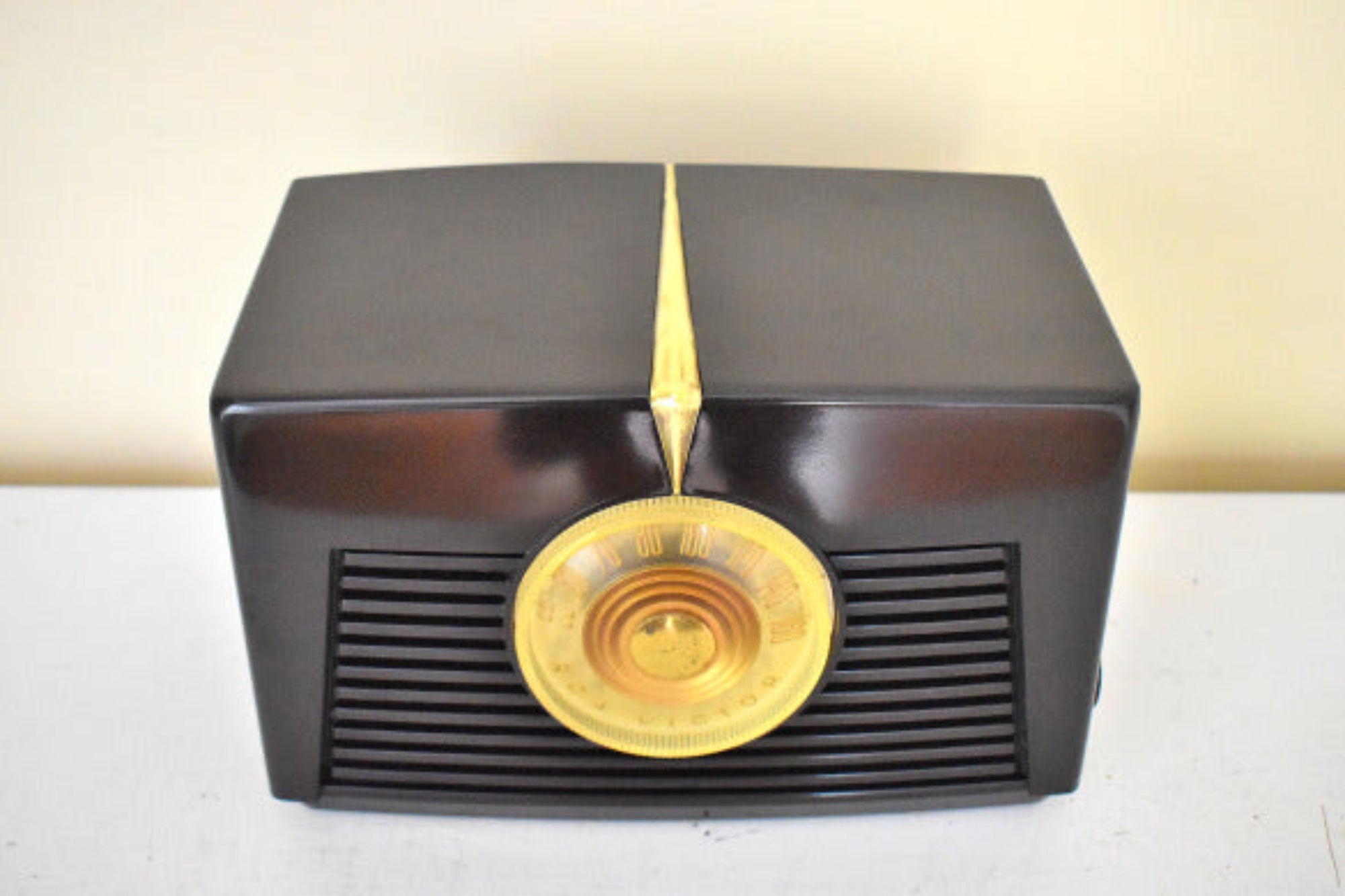 CABINET CONDITION: Cabinet is original factory molded Bakelite cabinet. No cracks, chips or major scratches or missing pieces. Not repainted, no touch up not over sprayed. Gold color metal tuning and top trim piece is shiny and securely attached.