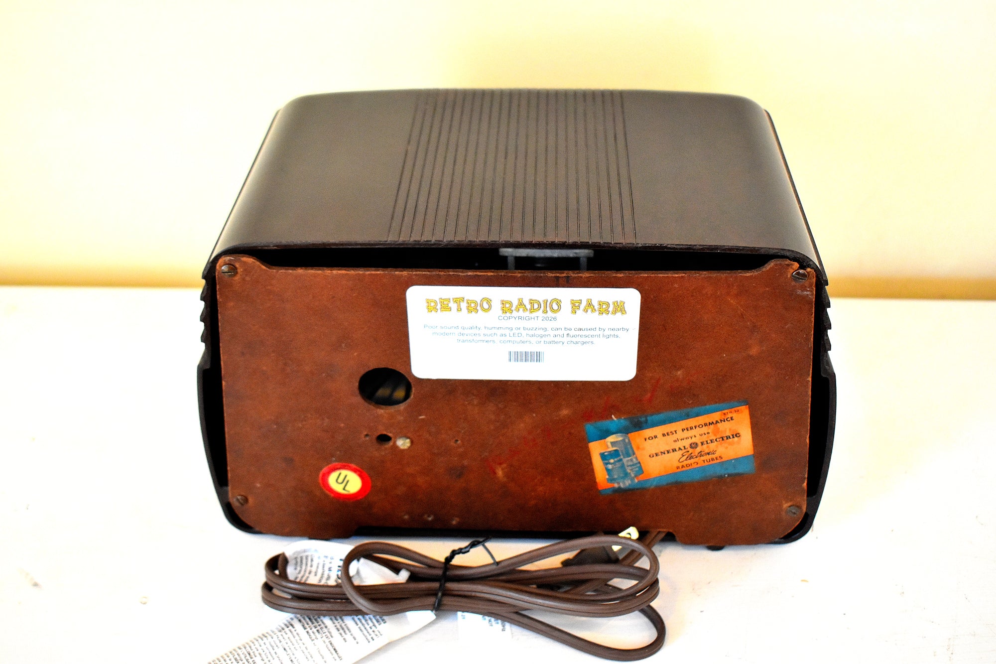 INTERNAL ELECTRONICS: All paper and wax capacitors have been replaced with modern equivalents so this radio has another 50+ years or more of playing time! The tubes are working fine. All out-of-spec resistors have been replaced with modern correct value and voltage equivalents. There is no loud or pervasive hum. There is no loud or pervasive static between stations. The set has been aligned according to factory specifications. All wiring has been thoroughly checked for possible bridging and weak solder connection. The radio has been thoroughly cleaned and inspected.