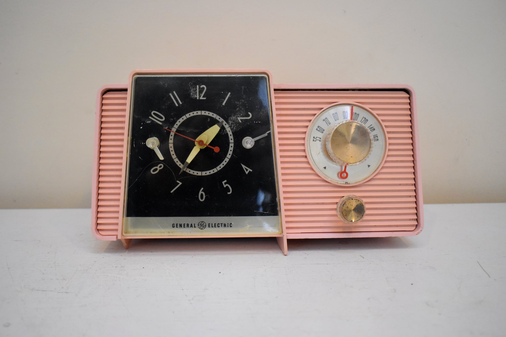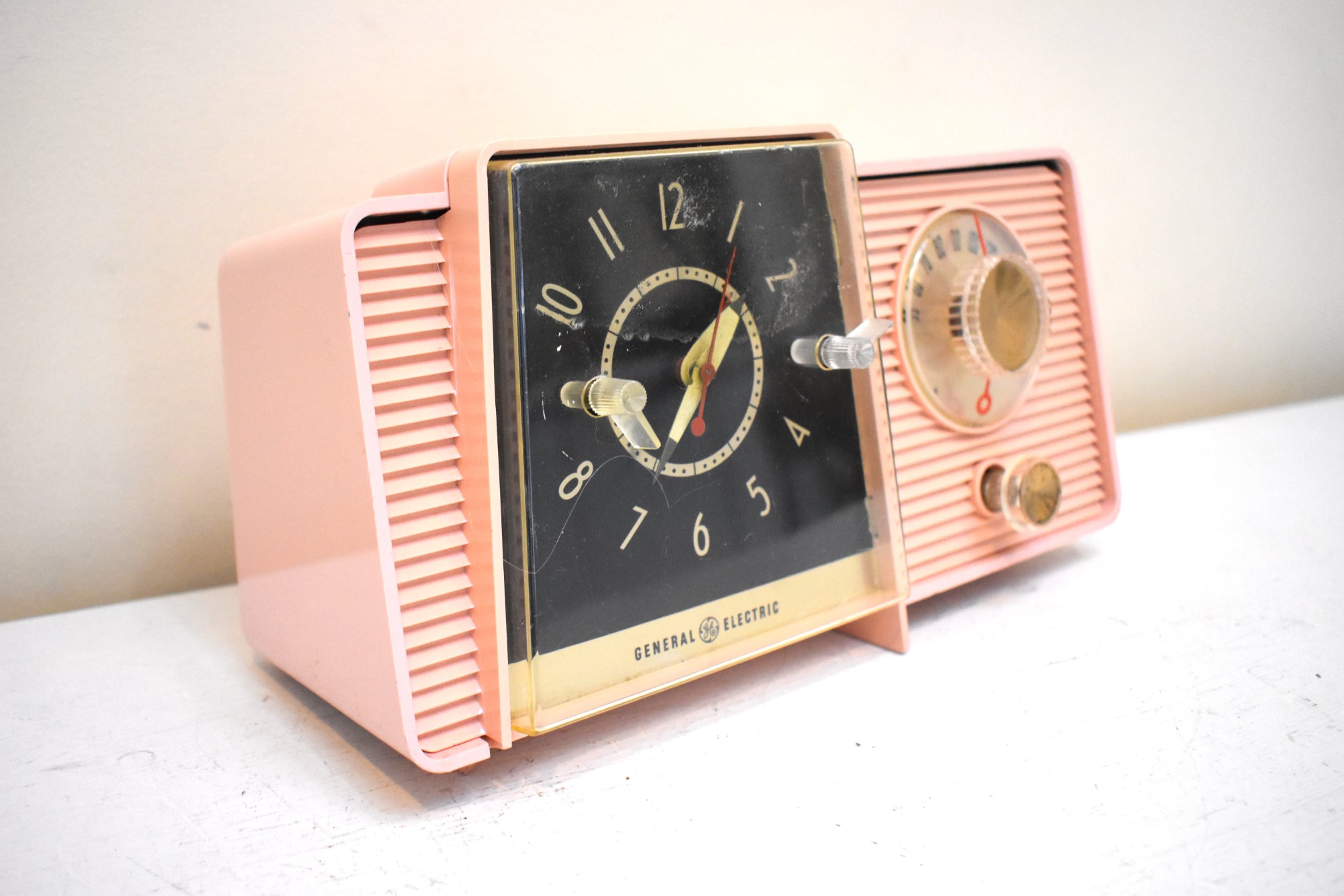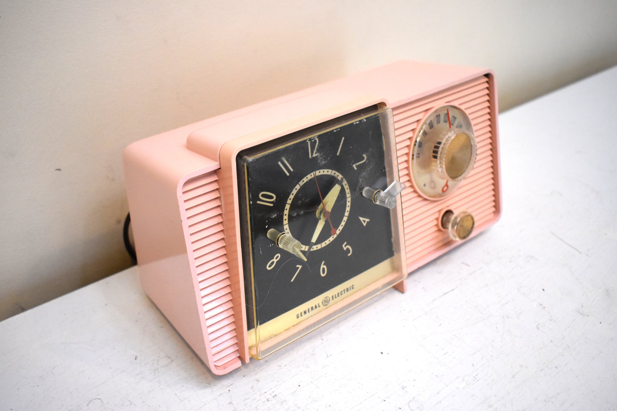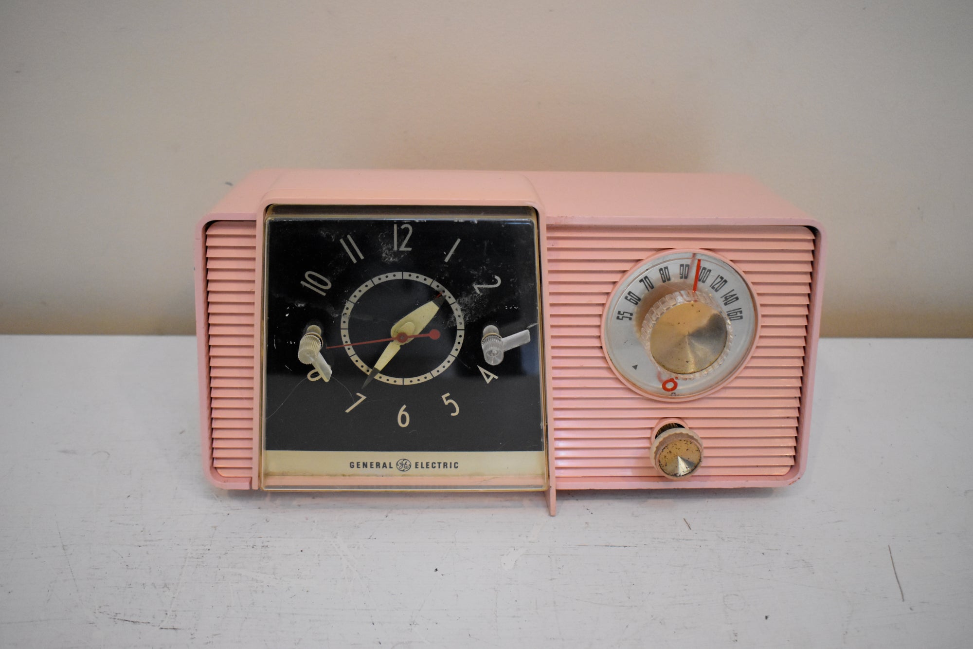CABINET CONDITION: The cabinet is in excellent condition with no cracks or major scratches. The left bottom foot is chipped off at the front but radio still sits level on its own. Original factory molded pink plastic through and through. No repaint. No over spray. No touch up. This radio is over 65 years old! The "ON", "OFF", "RADIO" lettering is mostly worn off which is often the case. The clock face is in excellent condition with no rust, pitting, or oxidation! The tuning dial works fine. No rub off numbers. Gold metal insert is not missing shiny no rust or tarnish. The front clock clear cover is not cracked no major scratches.