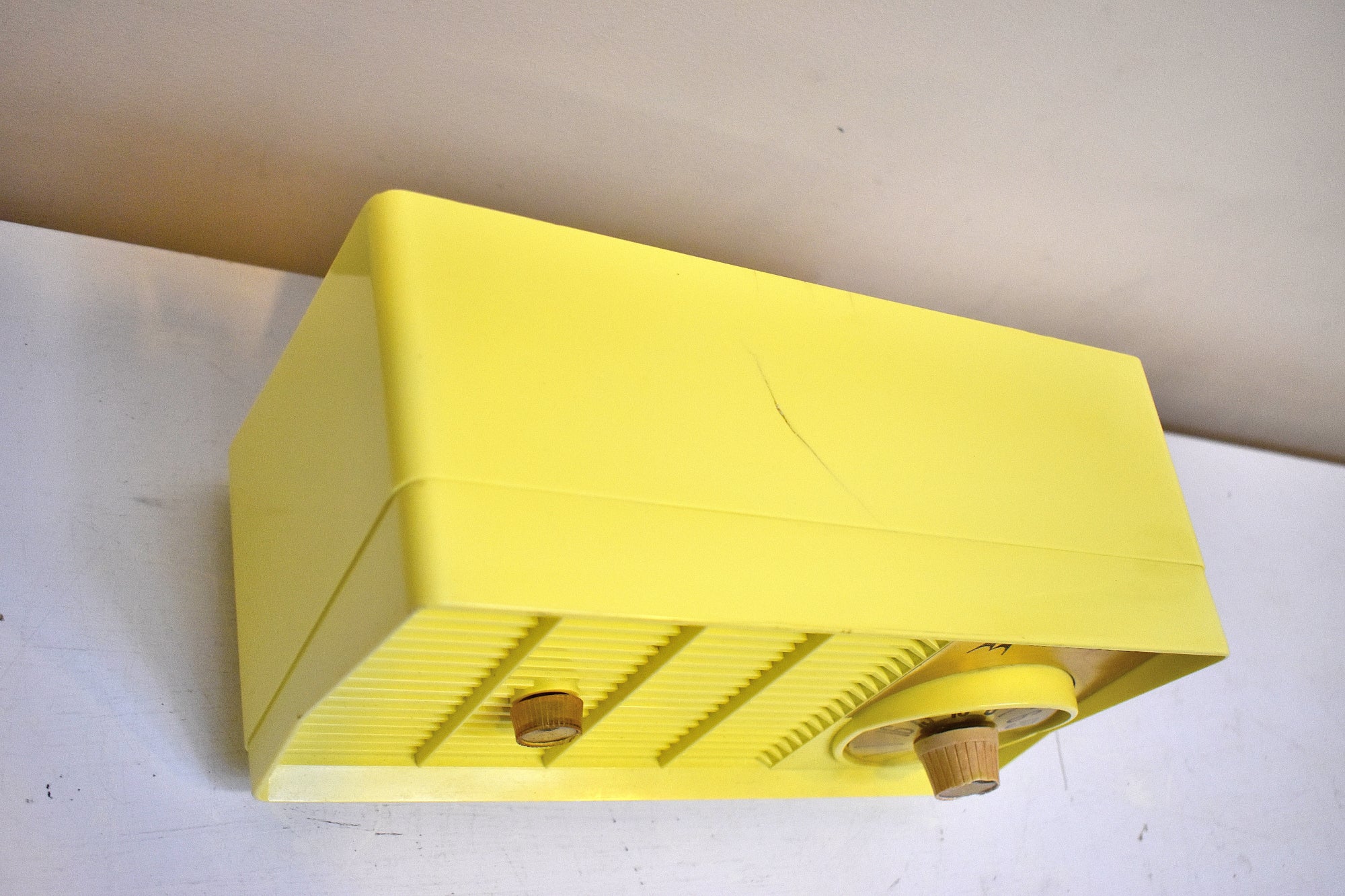 CABINET CONDITION: Cabinet is original factory molded yellow plastic. All original factory molded colors through and through. Not repainted. No touch up. No over spray. There are two small hairline heat crack on top that has been repaired and reinforced from below to minimize further cracking. Examples of this model series almost always have a crack on top by the back edge. There no chips, or major scratches or missing pieces. The tuning front fascia is in excellent condition with no water stains, no oxidation or discoloration.