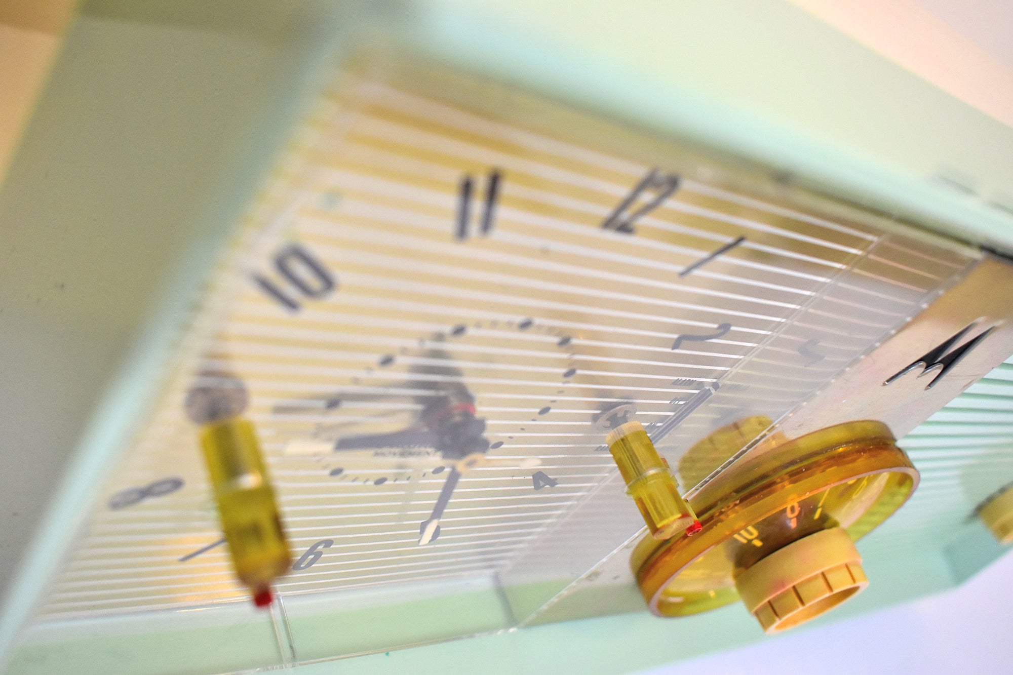 CABINET CONDITION: Cabinet is original factory molded green plastic front and ivory back. Not repainted. Has repaired chip on left side. No cracks, chips, or major scratches on the green front piece. Clock clear covers are original crystal clear no crack no scratches and securely mounted. Front aluminum fascia is original no rust or dents or dings not warped and securely mounted.