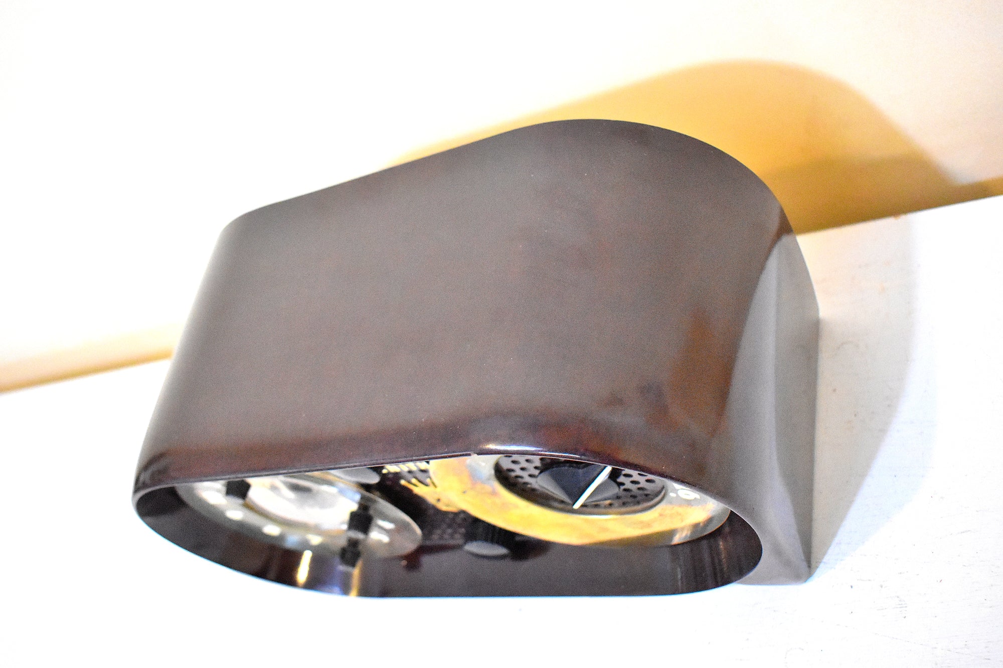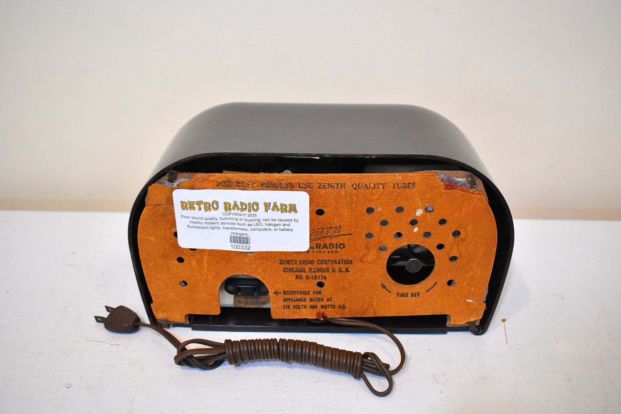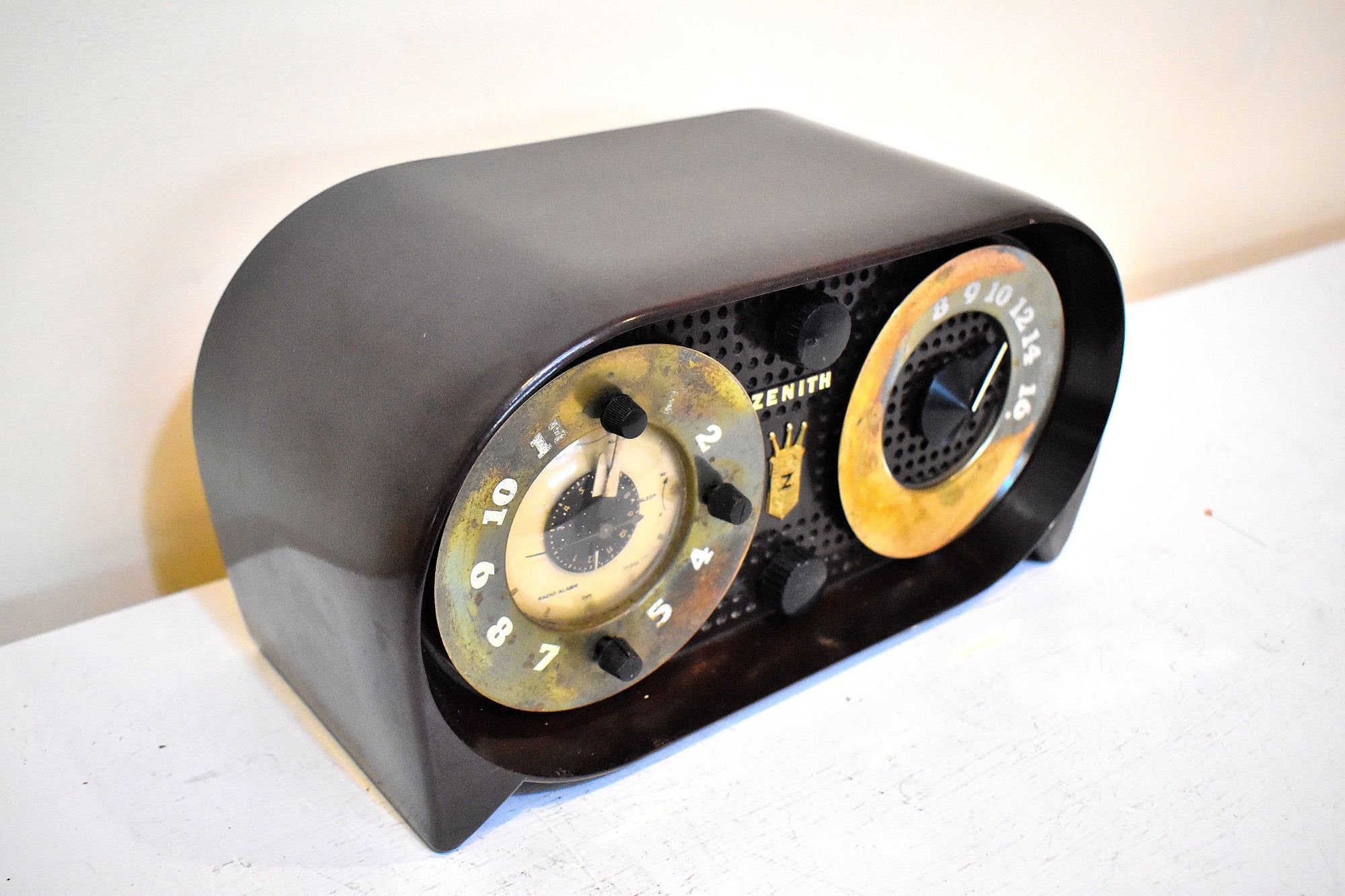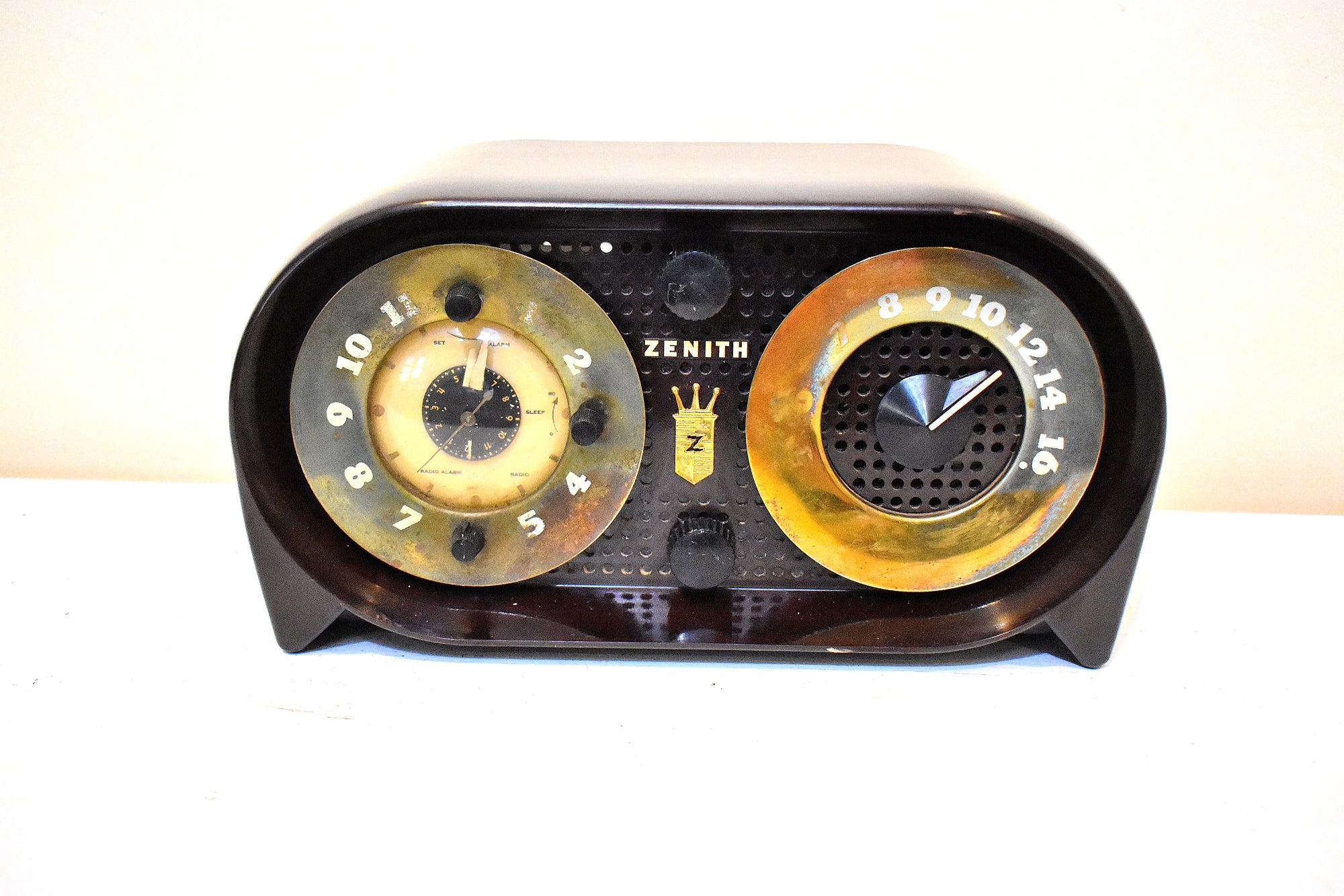 CABINET CONDITION: Beautiful Bakelite factory molded cabinet is in excellent condition with no cracks, no chips, no major scratches! Original factory brown Bakelite color not repainted no touch up and no over spray. This radio is over 60 years old! The front gold metal fascia tuning and clock surround trim is in excellent condition with very little tarnish no dents no dings. No missing ink, smudges, or rub-off on dial lettering. The tuning dial works fine no slipping no sticky spots.