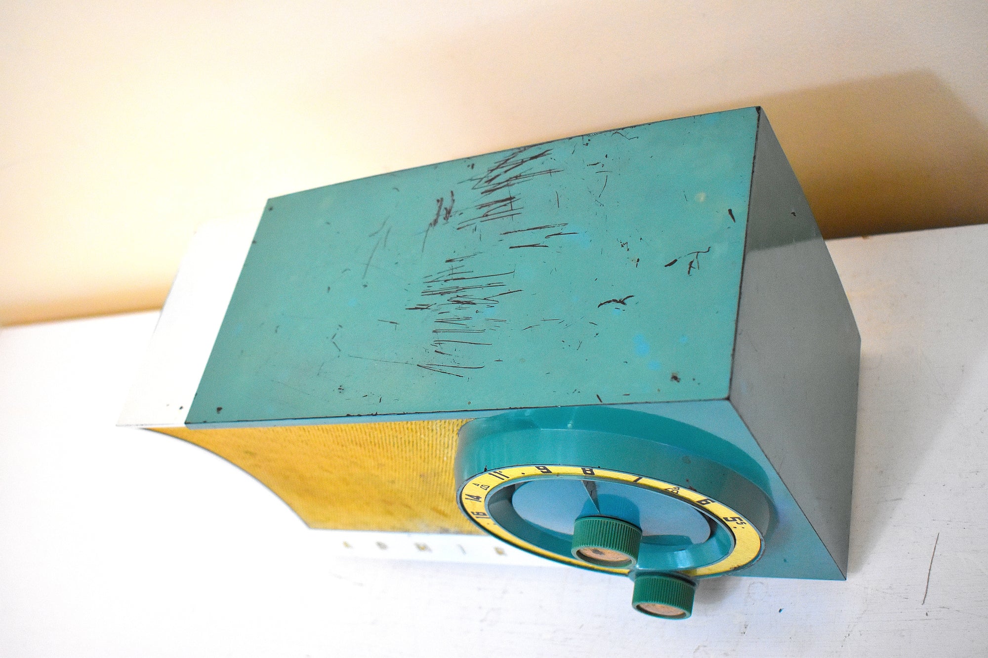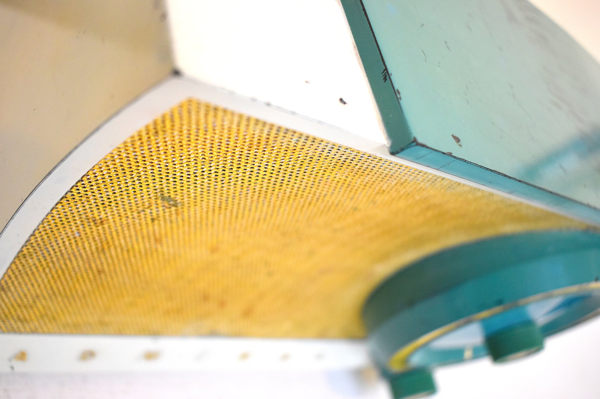 CABINET CONDITION: Cabinet is molded Bakelite repainted in original seafoam green and white color combo. No cracks, chips, or missing pieces. The top factory seafoam paint is scratched. The front gold mesh grill cover is in excellent condition with no holes or cracks.
