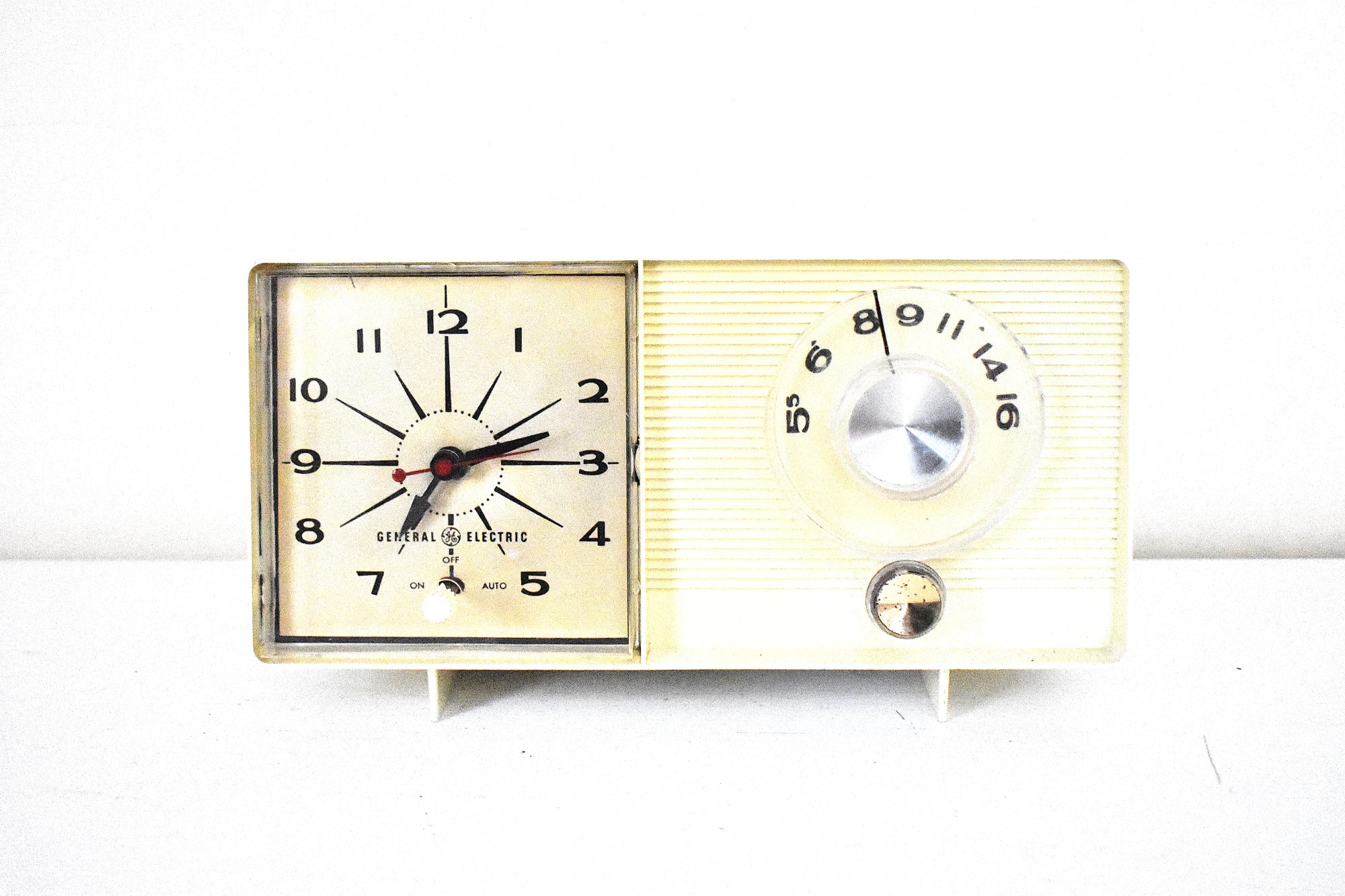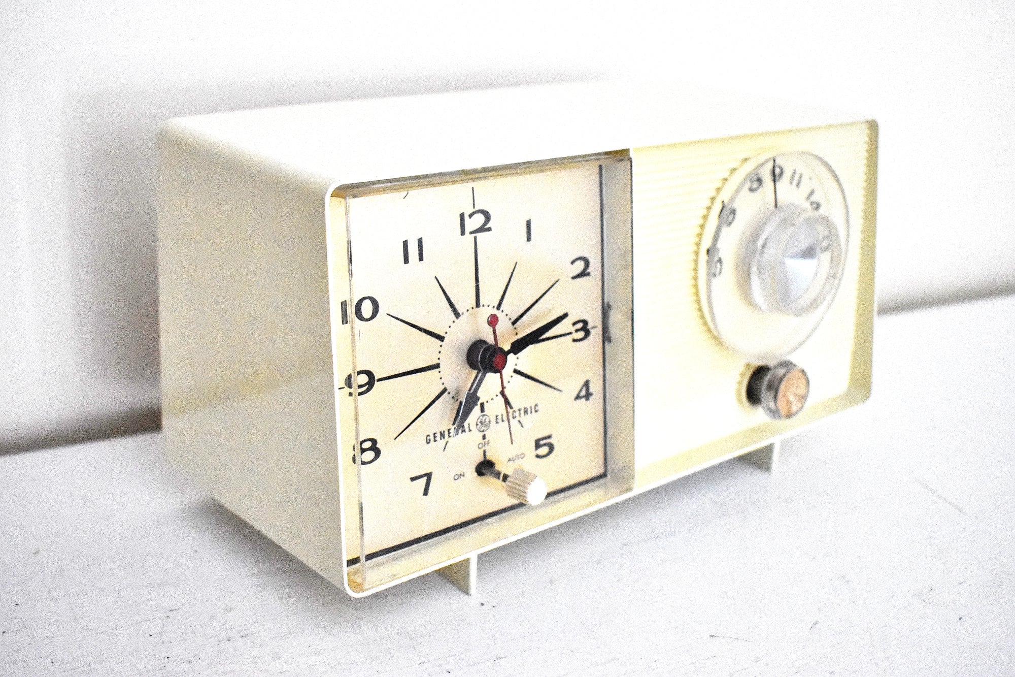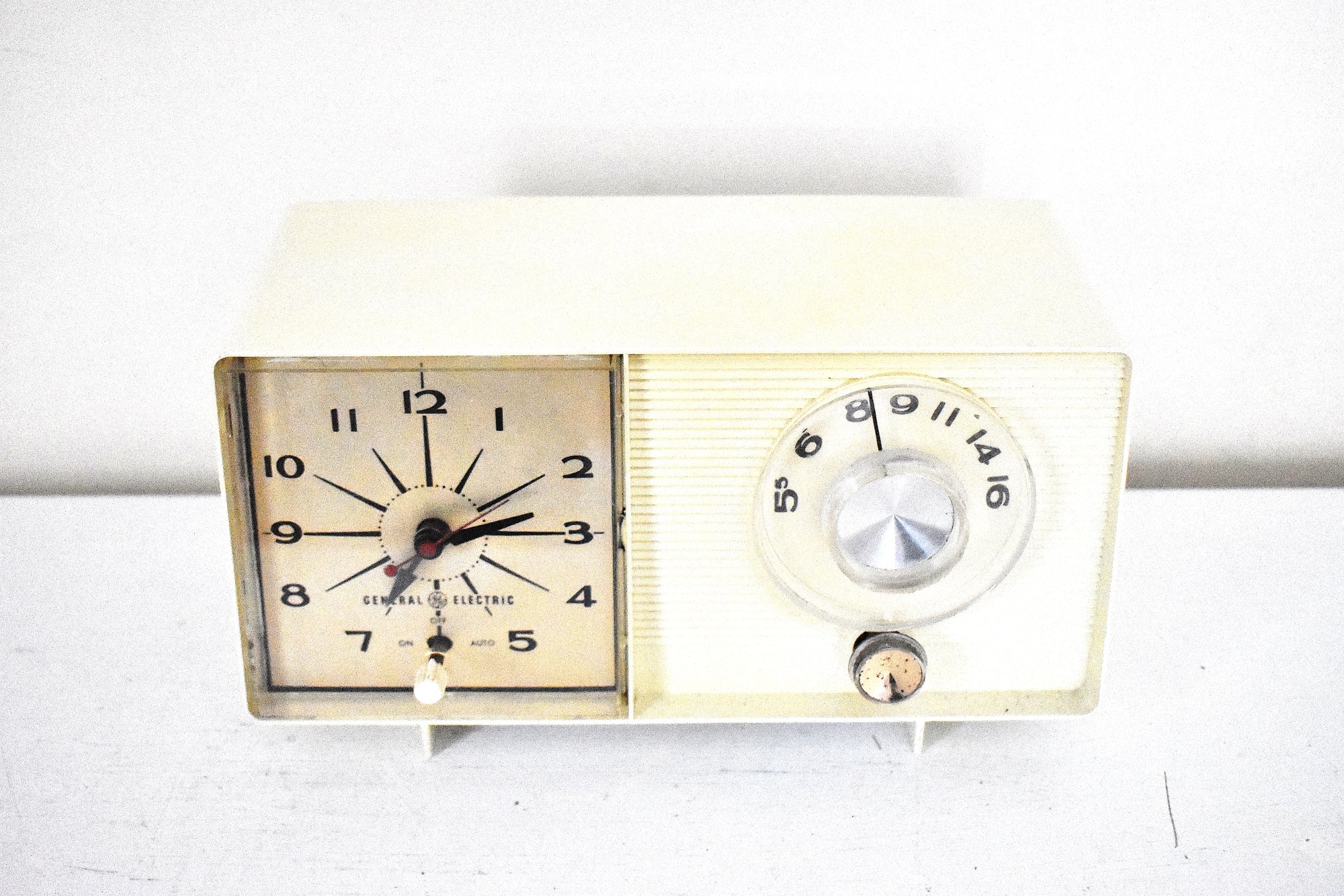DESCRIPTION: Tabletop tube AM clock radio alarm manufactured by General Electric in 1964 time frame in excellent working and physical condition.