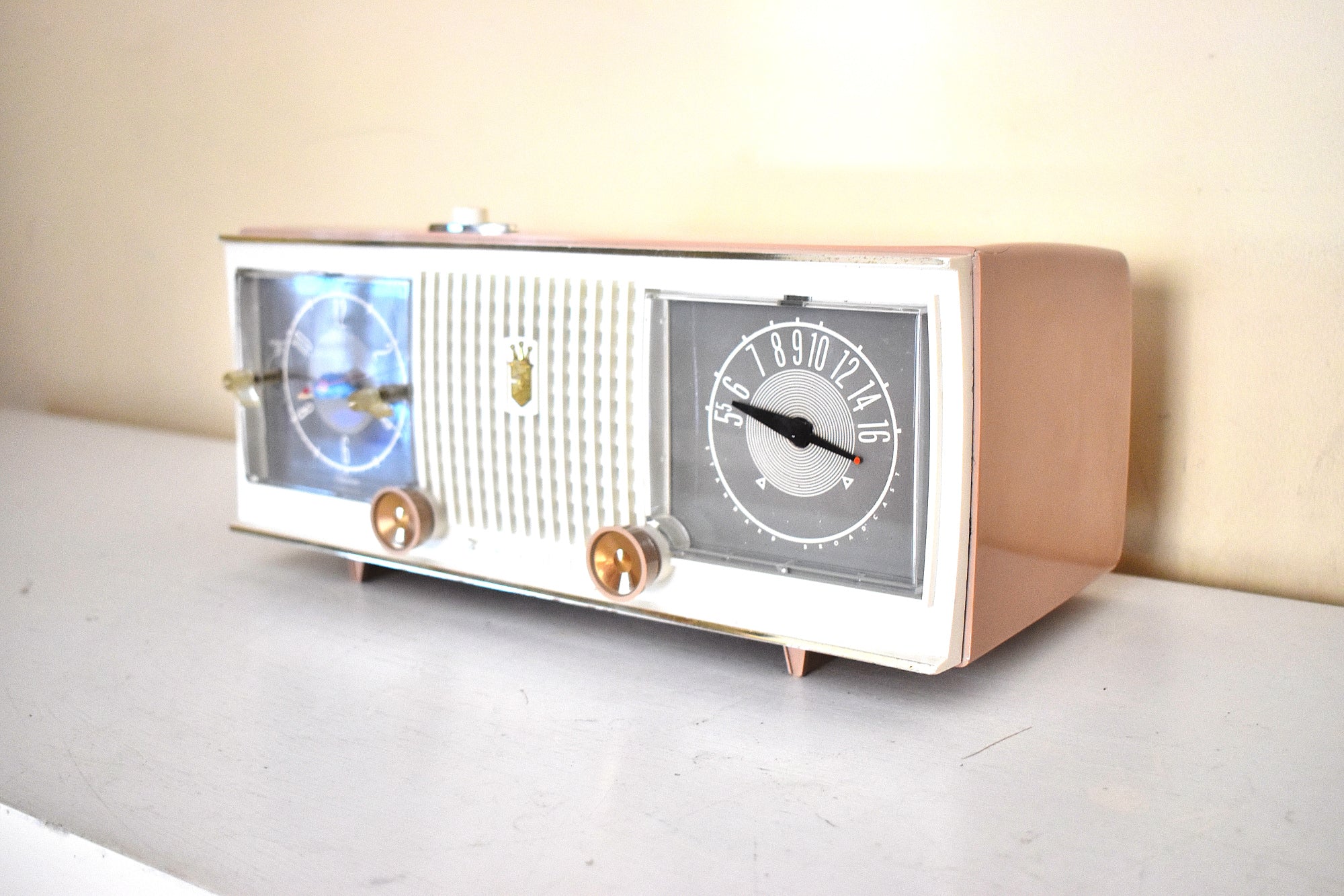 CABINET CONDITION: Cabinet is original factory molded sandalwood tan back and white front plastic. Not repainted. No major scratches or missing pieces. There is a small hairline crack on the top right top edge. Beautiful low and sleek profile. Tuning and clock clear covers are original crystal clear no scratches and securely mounted. Clock cover has cracks. Tuning and clock back panels are grey color in excellent condition with no rust, stains, or flaking.