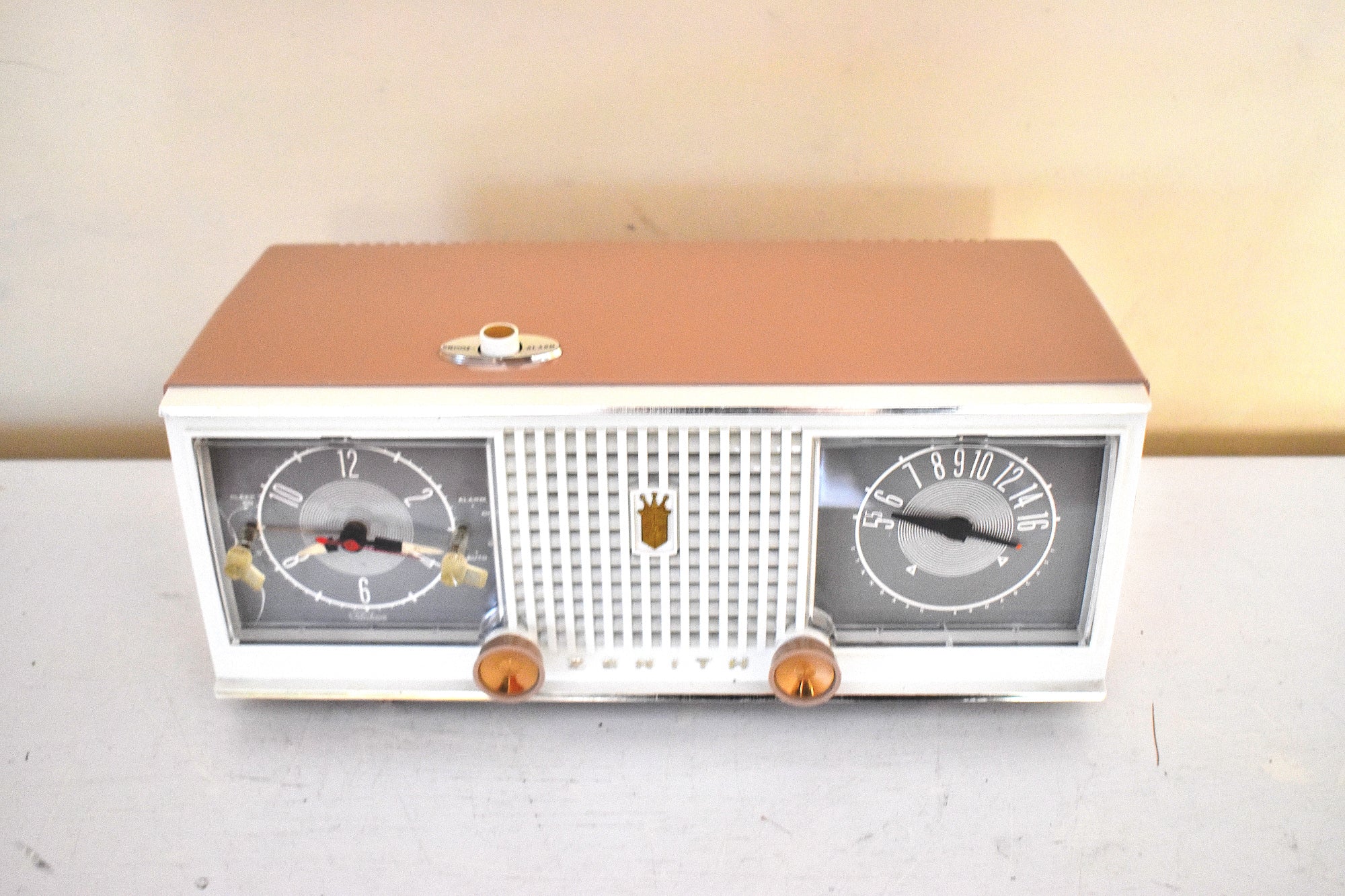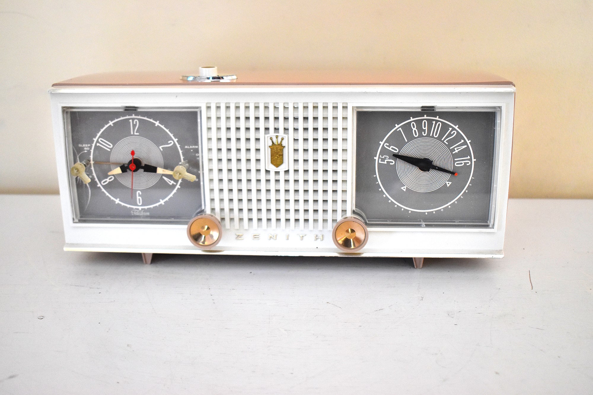 DESCRIPTION: Low and sleek tabletop vacuum tube AM clock radio alarm manufactured by Zenith in 1960 in excellent working and physical condition.