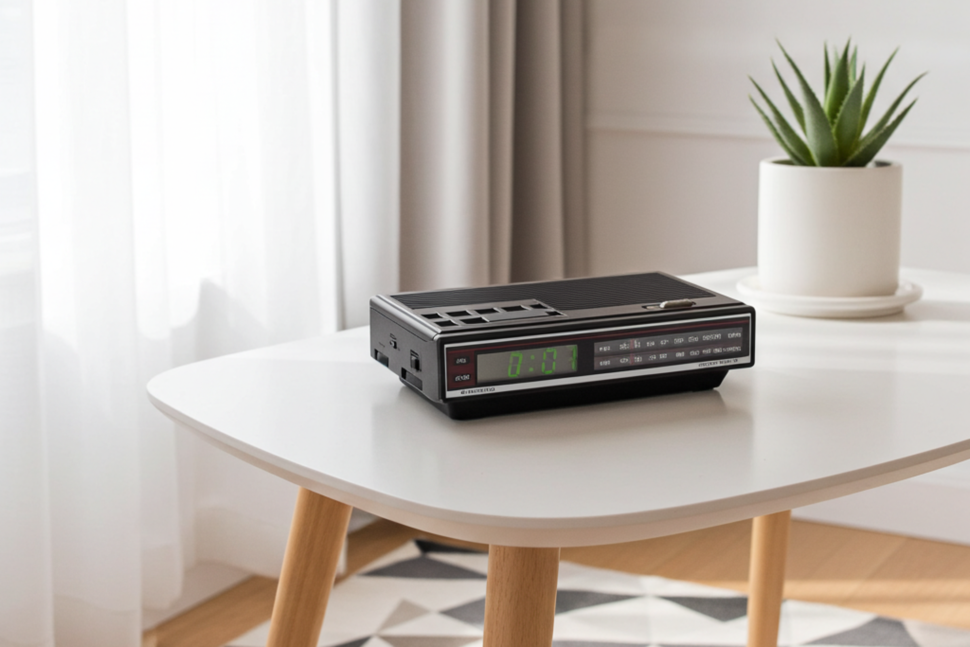 CLOCK: Front display is clear and bright original green color LED. All segments of digital display are bright. Brightness does not flutter or get dim unreliably Does not visibly blink. Clock keeps accurate time. AM or PM LED indicator dot is accurate. Wake to music or buzzer. Clock and alarm time is set using buttons on top. Alarm goes off correctly at the set time.