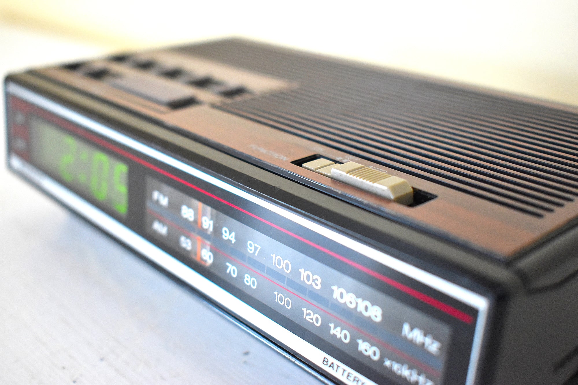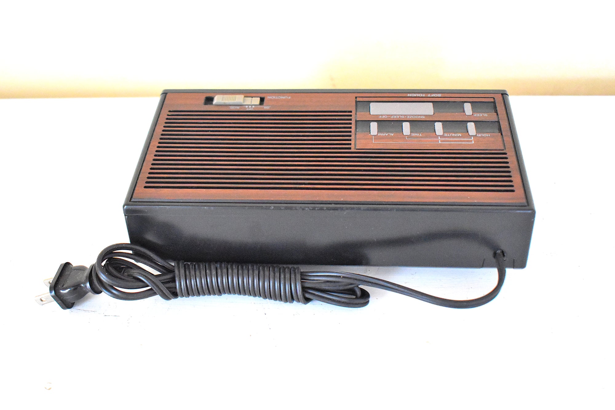 CABINET CONDITION: Cabinet is original factory molded black plastic with simulated wood grain on top, and sides. Not repainted no touch up not over sprayed. No cracks, chips, or major scratches. Original matching buttons on top for time and alarm set, band selector, ON/OFF/Alarm/Auto, and snooze. Front clear clock cover is in excellent condition no cracks, chips or major scratches, securely attached.