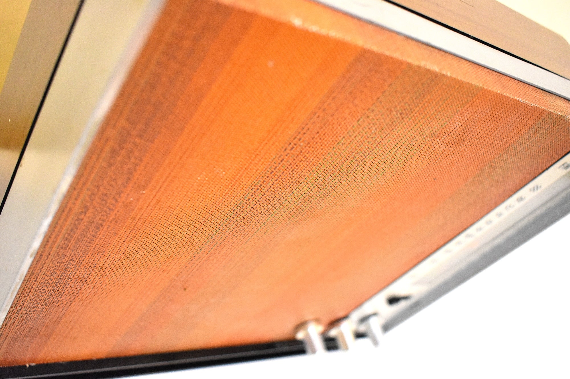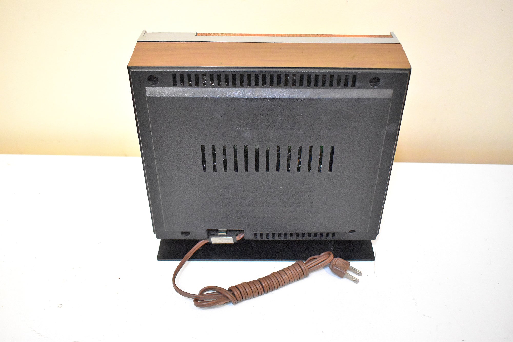 CABINET CONDITION: Cabinet is original factory molded black color plastic with factory faux woodgrain effect on top and sides. No cracks, chips or major scratches or missing pieces. All original factory molded colors through and through. Not repainted, no touch up, no over spray. Front metal pinhole screen grill is factory painted multi color decorative pattern. Not fabric but looks like it. Not repainted or touched up or over sprayed. Aluminum trim piece is original and excellent condition not dented or dinged, or wavy, securely attached. No worn off factory function printing.