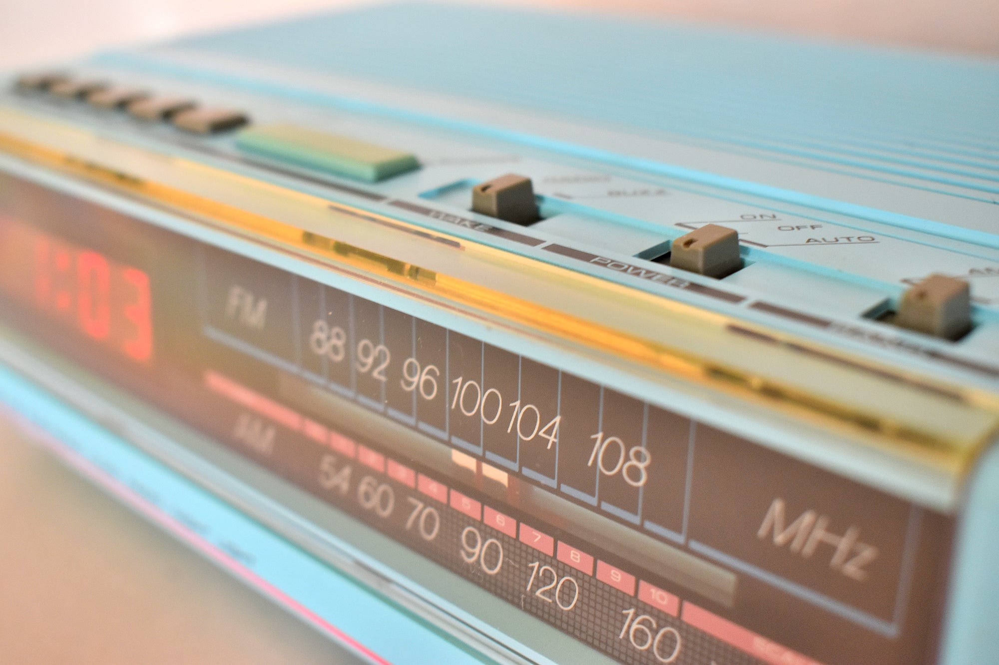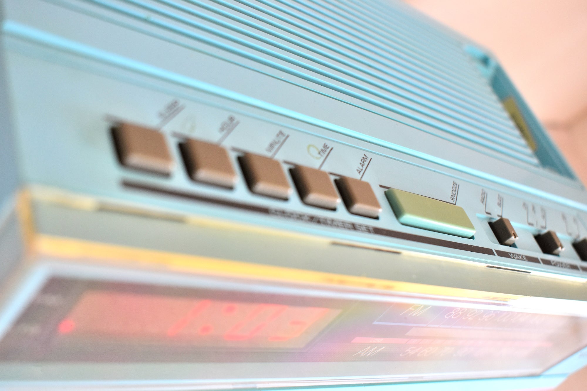 CLOCK: Front red digital display is clear and bright original red color LED. All segments of digital display are bright. Brightness does not flutter or get dim unreliably Does not visibly blink. Clock keeps accurate time. AM or PM LED indicator dot is accurate. Wake to music or buzzer. Clock and alarm time is set using buttons on top. Alarm goes off correctly at the set time.