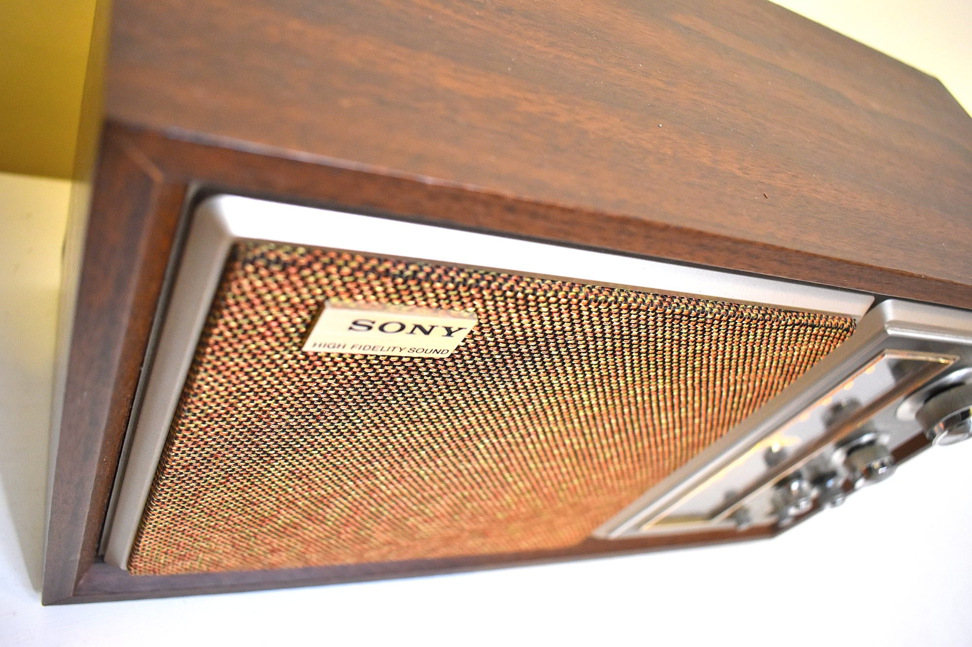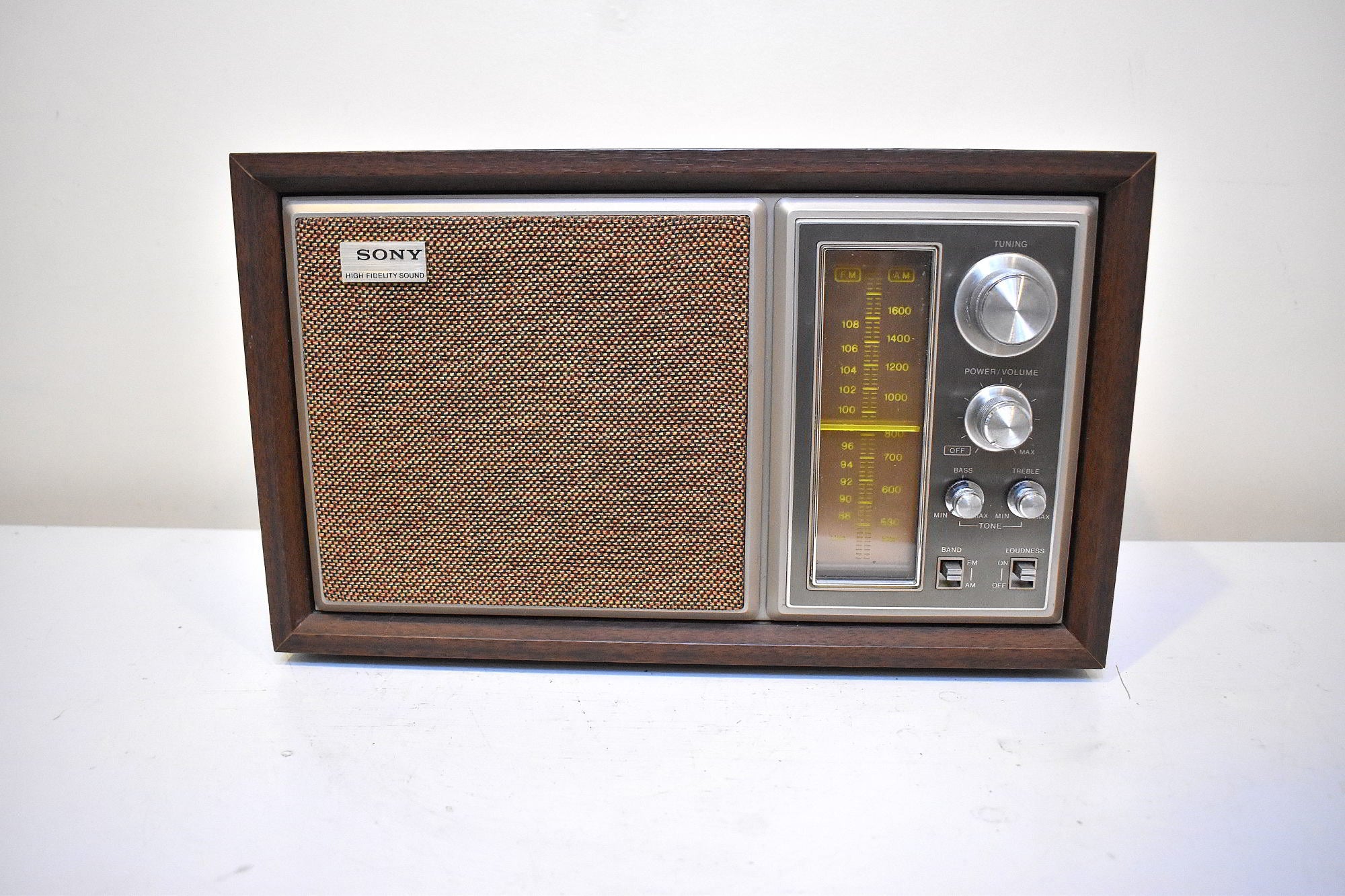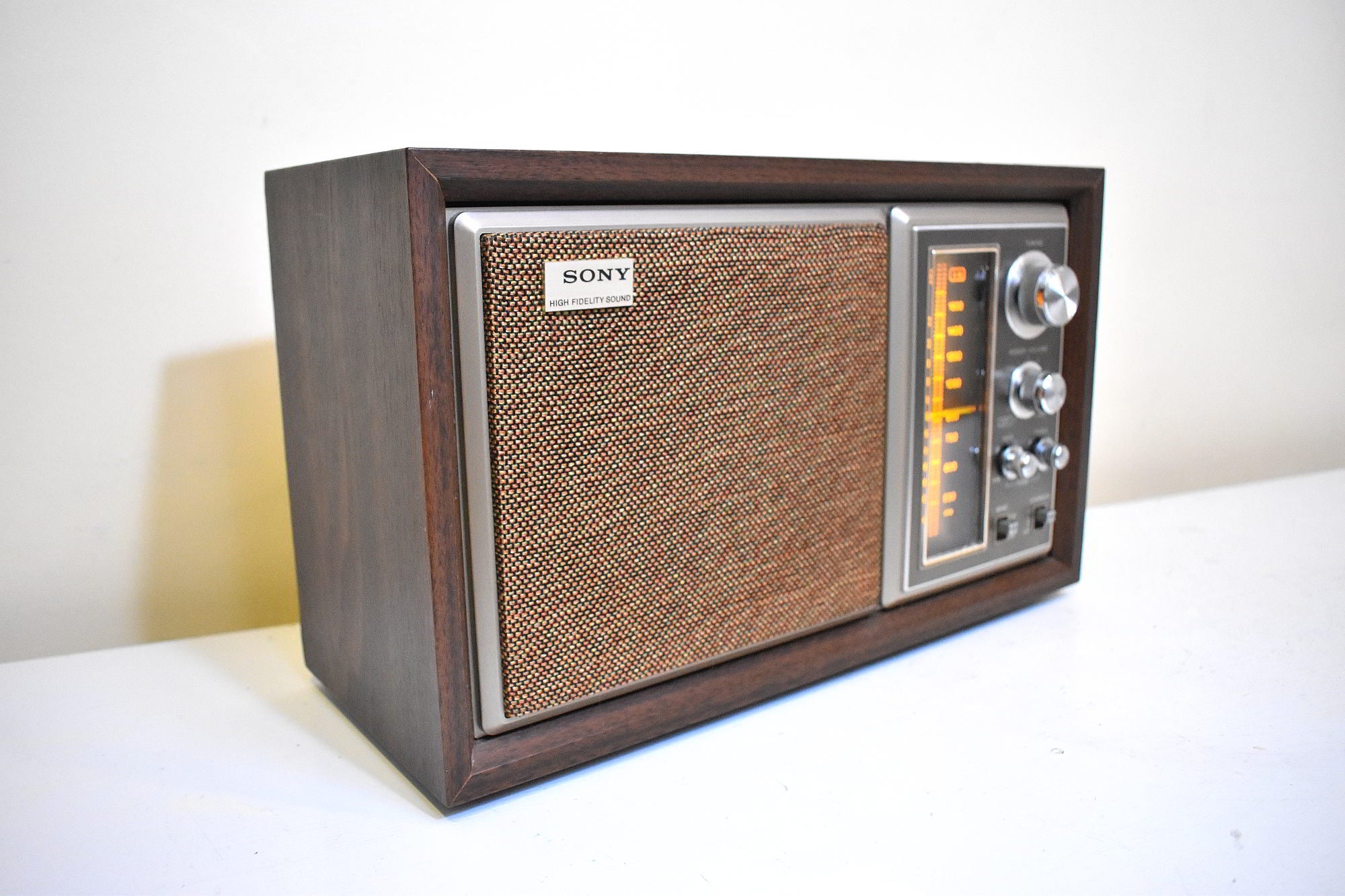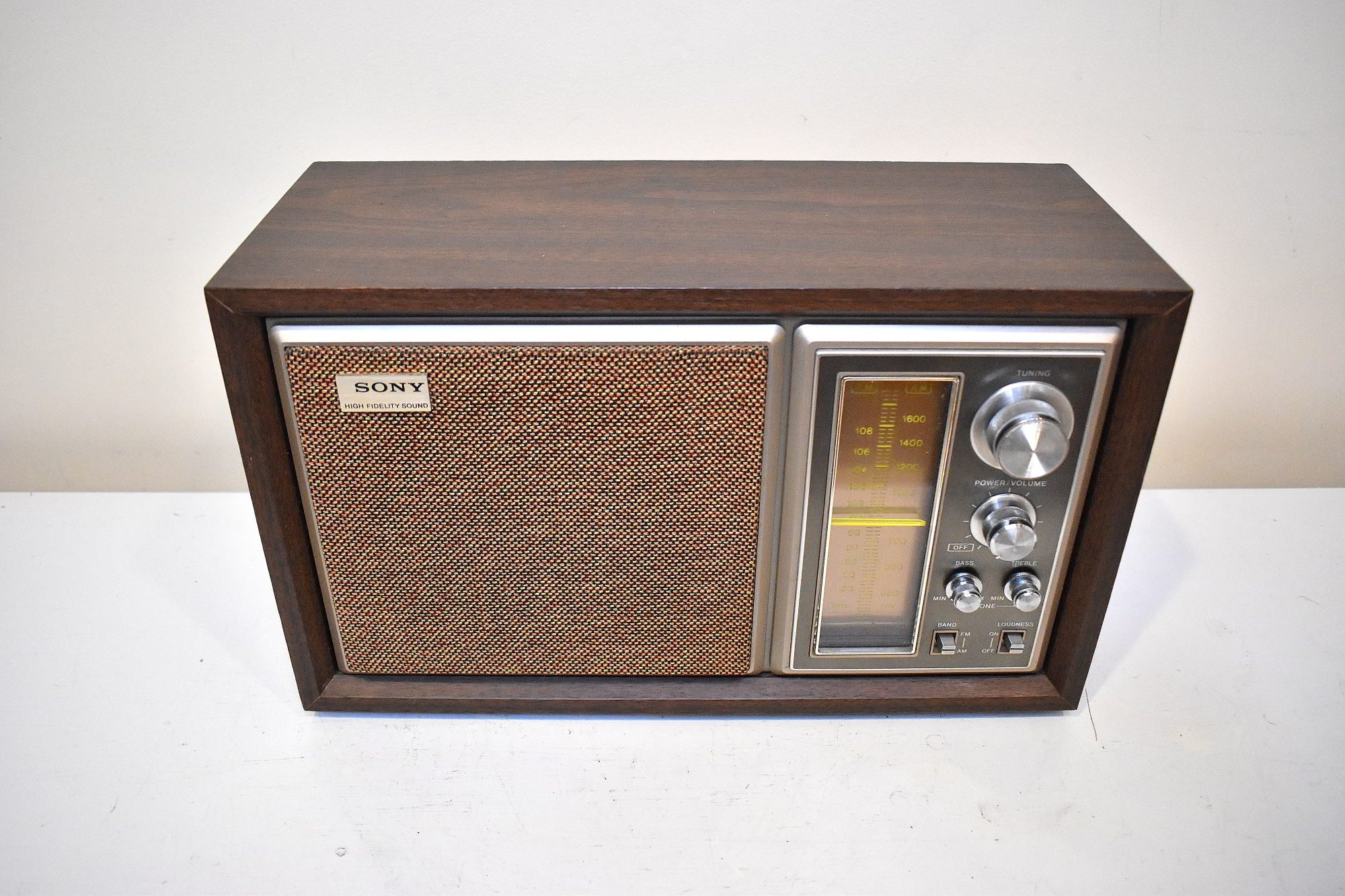 DESCRIPTION: listen once and you will see why Sony was a dominant electronics import manufacturer throughout the seventies and eighties. Solid state transistor radio manufactured by Sony in mid to late 1970s time frame in excellent working and excellent physical condition. Modern style design with walnut grain covering and brushed aluminum trim.