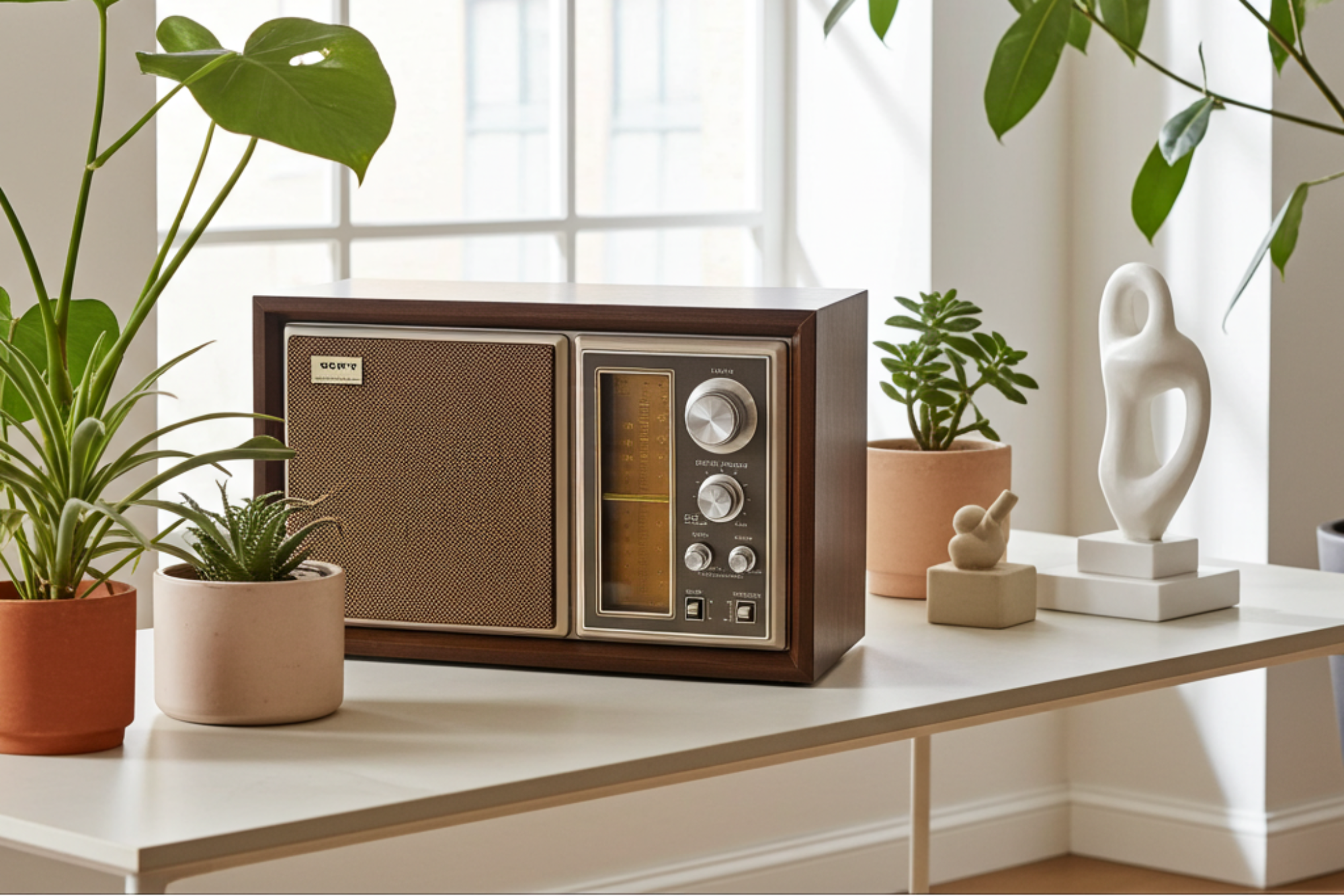 Product: antique radio, vintage radio, retro radio, vacuum tube radio, AM radio, art deco, mid-century product.