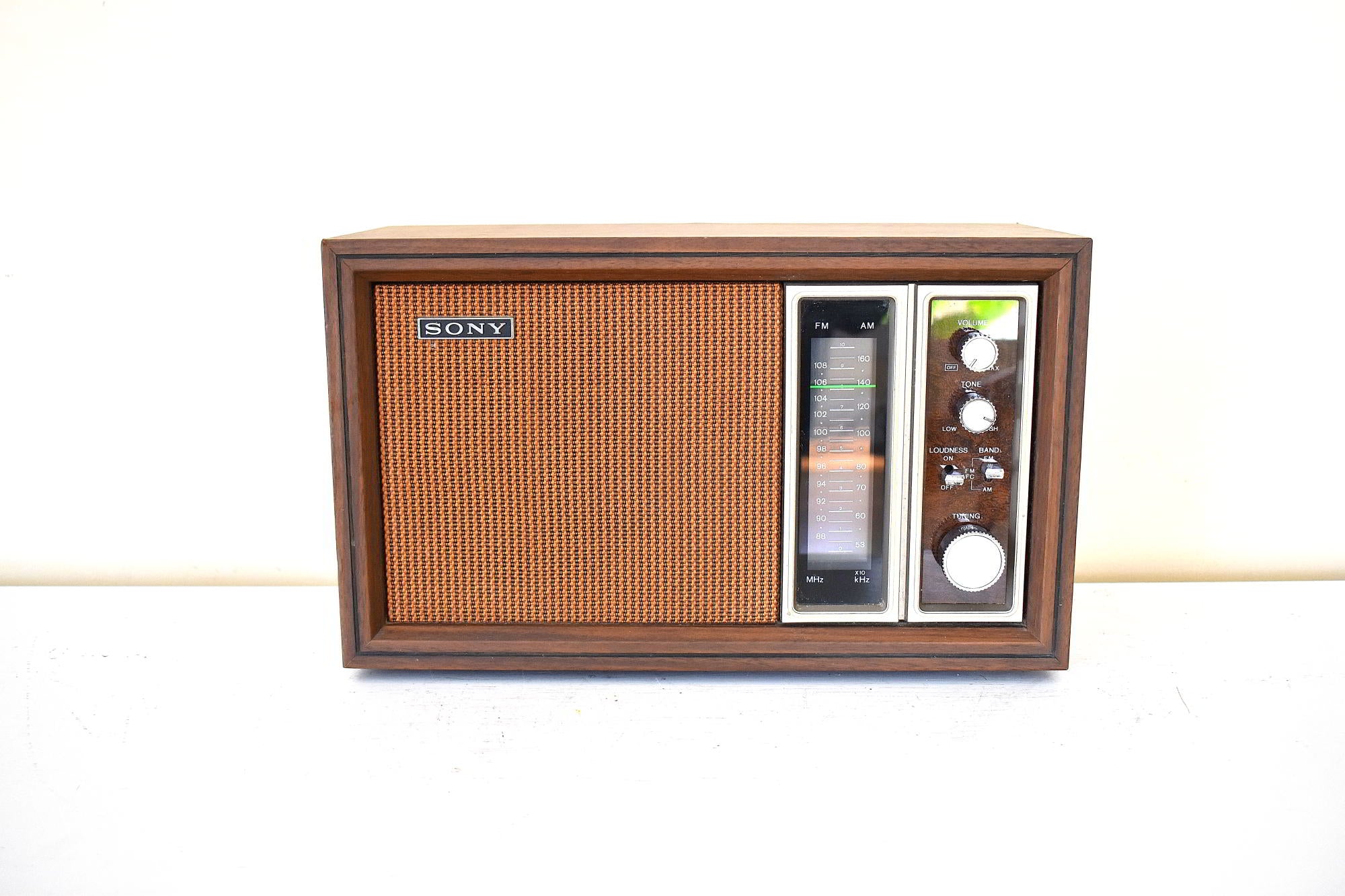 DESCRIPTION: One listen and you will see why Sony was a dominant electronics import manufacturer throughout the seventies and eighties. Solid stae transistor radio manufactured by Sony in mid to late 1970s time frame in excellent working and very good physical condition. Modern style design with walnut grain covering and brushed aluminum trim.