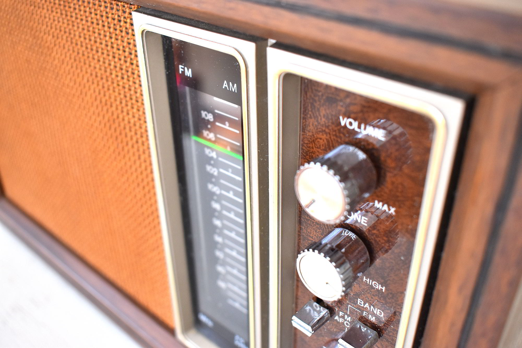 CABINET CONDITION: Cabinet is original factory constrcuted wood cabinet with walnut grain vinyl covering. Not repainted. No touch ups. No over spray. There is a small corner dent on the top back left corner. The wood cabinet is strong and sturdy. The controls panel and aluminum trim is in excellent original condition with no cracks, no chips, no major scratches. Function lettering and numbering is not worn off. Grill fabric is original with no rips, some fraying, no seperation along edges, no prominent major stains.