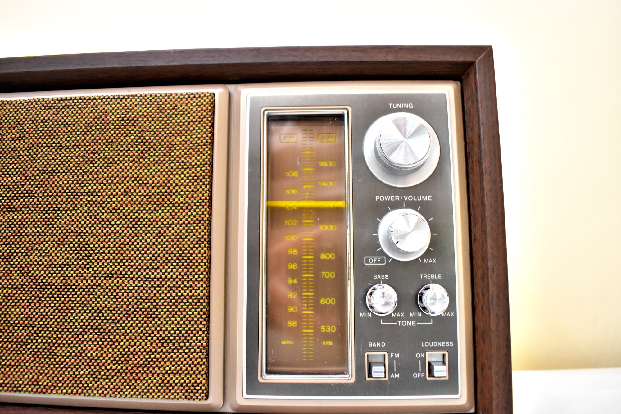 CABINET CONDITION: Cabinet is original factory constructed wood cabinet with walnut grain vinyl covering. Not repainted. No touch ups. No over spray. The wood cabinet is strong and sturdy. The controls panel and aluminum trim is in excellent original condition with no cracks, no chips, no major scratches. Function lettering and numbering is not worn off. Grill fabric is original with no rips, no fraying, no separation along edges.