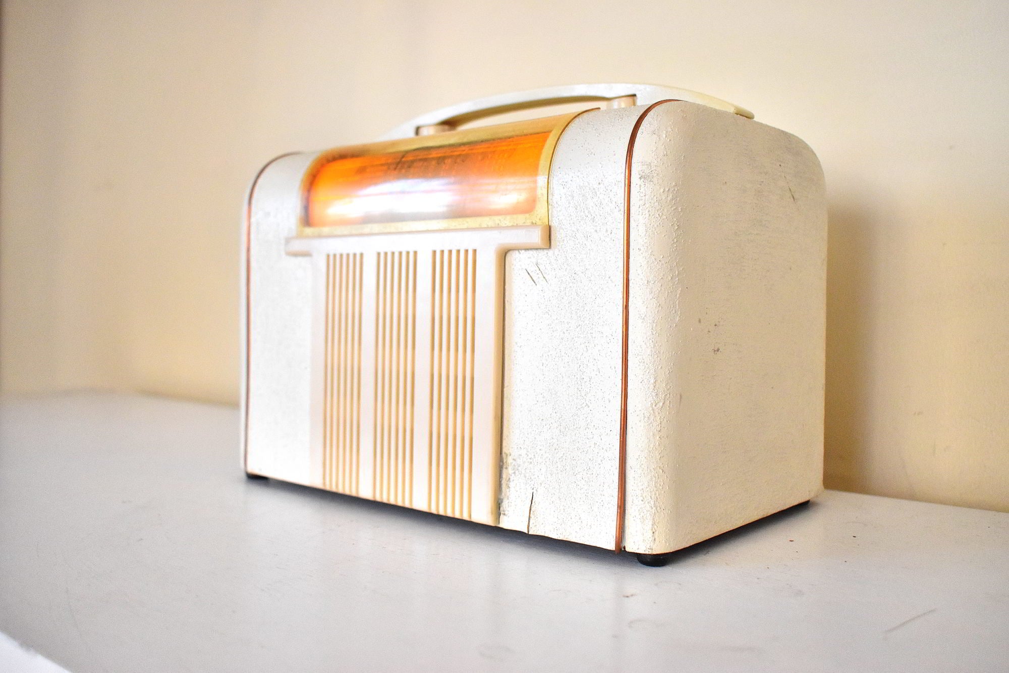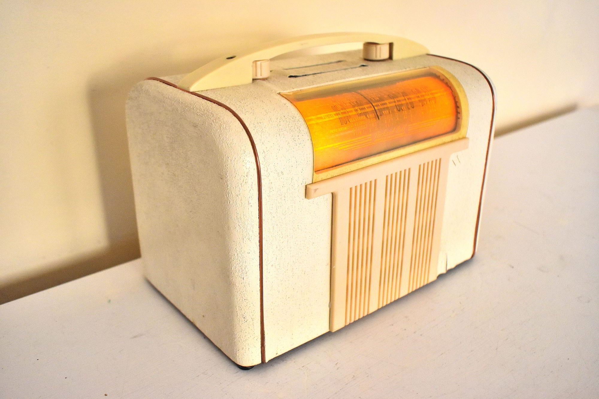 CABINET CONDITION: Cabinet is original factory wood cabinet with factory painted white spackle textured finish. No cracks, chips or major scratches or missing pieces. No flaking or cracked paint. Original factory wood veneer under white spackle paint is bubbling in some spots. Tuning clear window is not cracked no major scratches. The clear tuning window on this model is usually missing among surviving examples of this model. Tuning back panel silver paper is in ecellent condition. Original ivory plastic grill piece is in excellent condition with not cracks, chips, and securely attached.