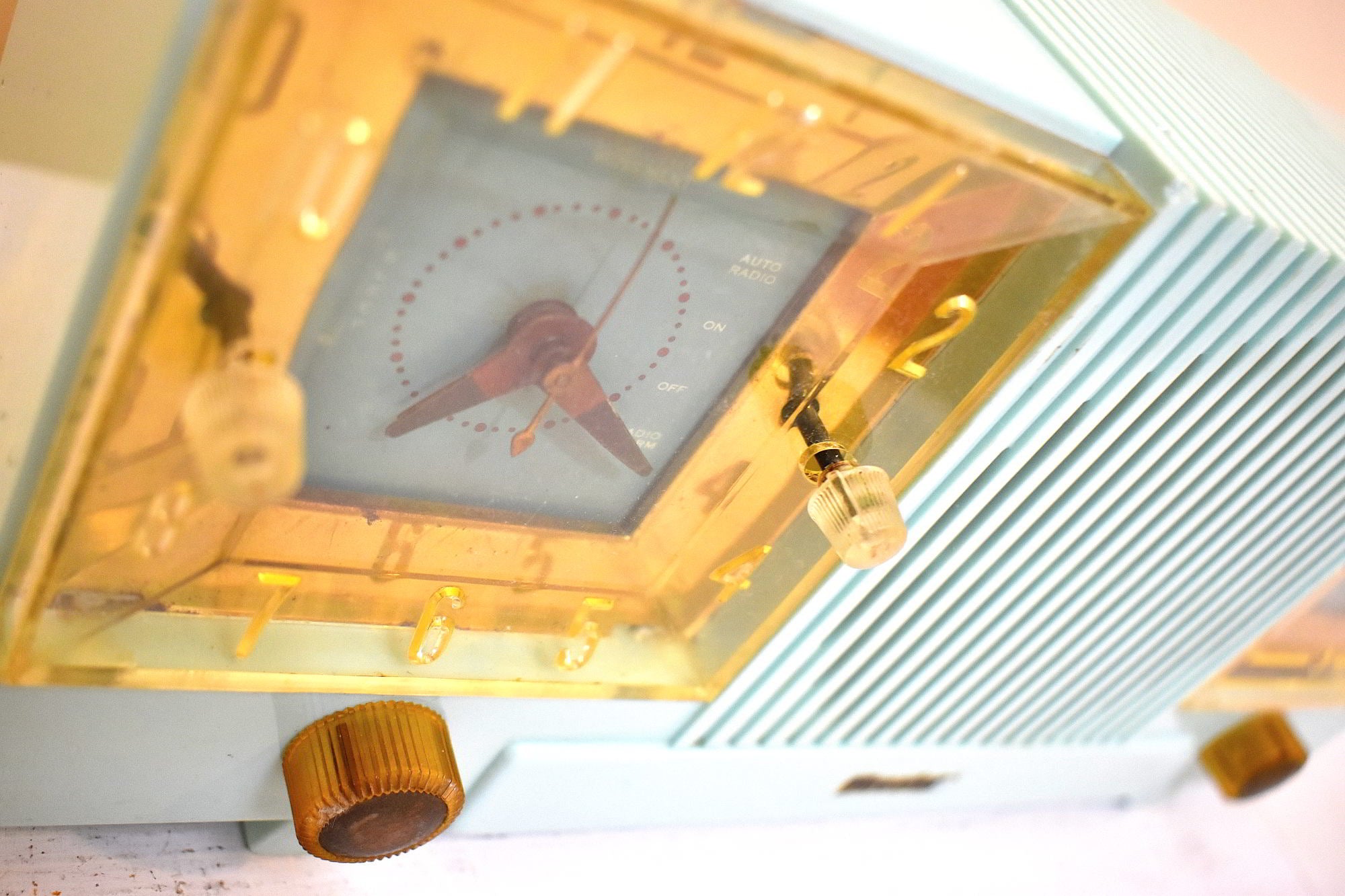 CABINET CONDITION: Original factory molded cabinet in light blue plastic. All original factory molded colors through and through. Not repainted. No touch up no over spray. Cabinet is in excellent condition with no cracks, no chips, no major scratches. This radio is over 69 years old! The clock and tuning face clear bezels are not cracked or chipped, No missing ink, smudges, or rub-off on tuning dial lettering on the clock or radio tuning bezel. The gold color clock and tuning internal square surround is in excellent condition with no fading, oxidation or stains. The clear bezels are securely attached with no major scratches. The clear cover bezel attachment tabs are not cracked off which is common on this model. The tuning indicator translucent green is in excellent condition.