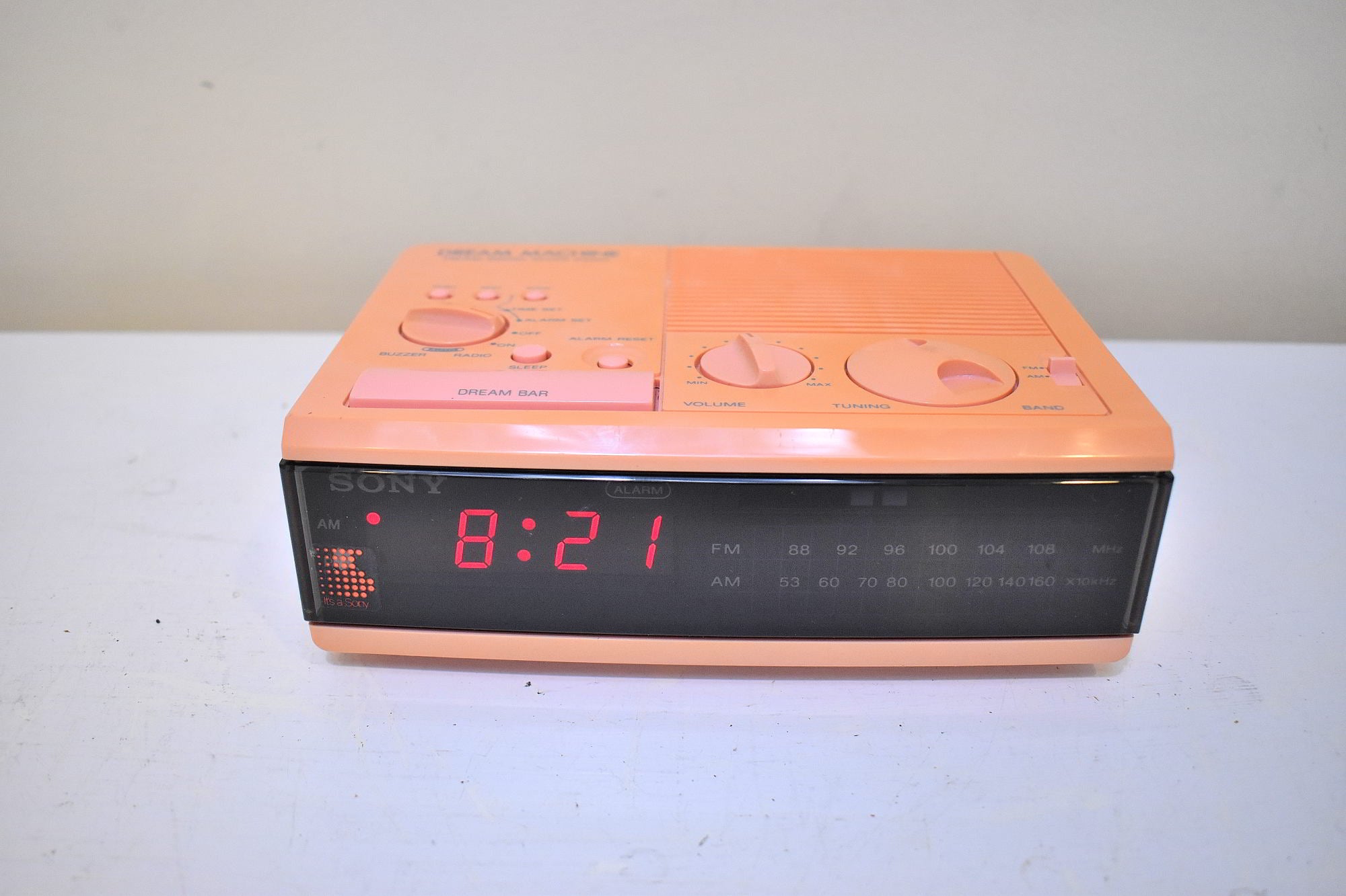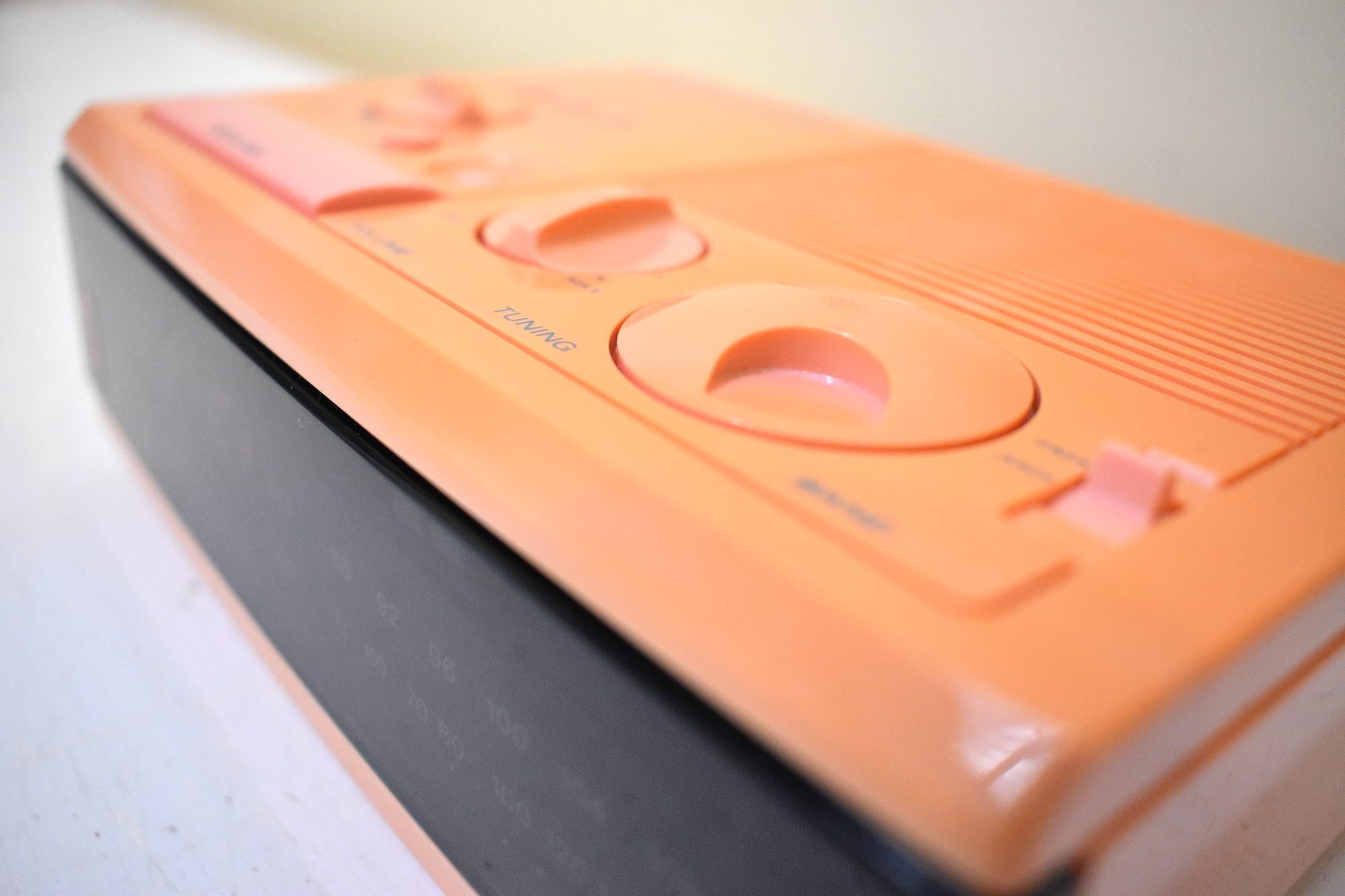 CABINET CONDITION: Cabinet is original factory shiny molded pink plastic through and through. Yellowed with age and exposure on top, front, and sides to a peachy orange-ish color. Not repainted no touch up not over sprayed. No cracks, chips, or major scratches. Original matching buttons on top for time and alarm set, band selector, ON/OFF/Alarm/DREAM functions.