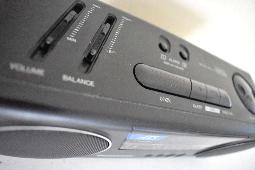 CABINET CONDITION: Cabinet is original factory shiny molded black matte plastic through and through with top and sides. Not repainted no touch up not over sprayed. No cracks, chips, or major scratches. Original matching buttons for time and alarm set, band selector, Volume, Left Right Balance, ON/OFF/Alarm, Alarm A and Alarm B, display brightness functions.