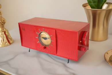Cardinal Red White 1955 Philco Model D738-124 AM Vacuum Tube Alarm Clock Radio Beautiful with Rare Working Clock Light!