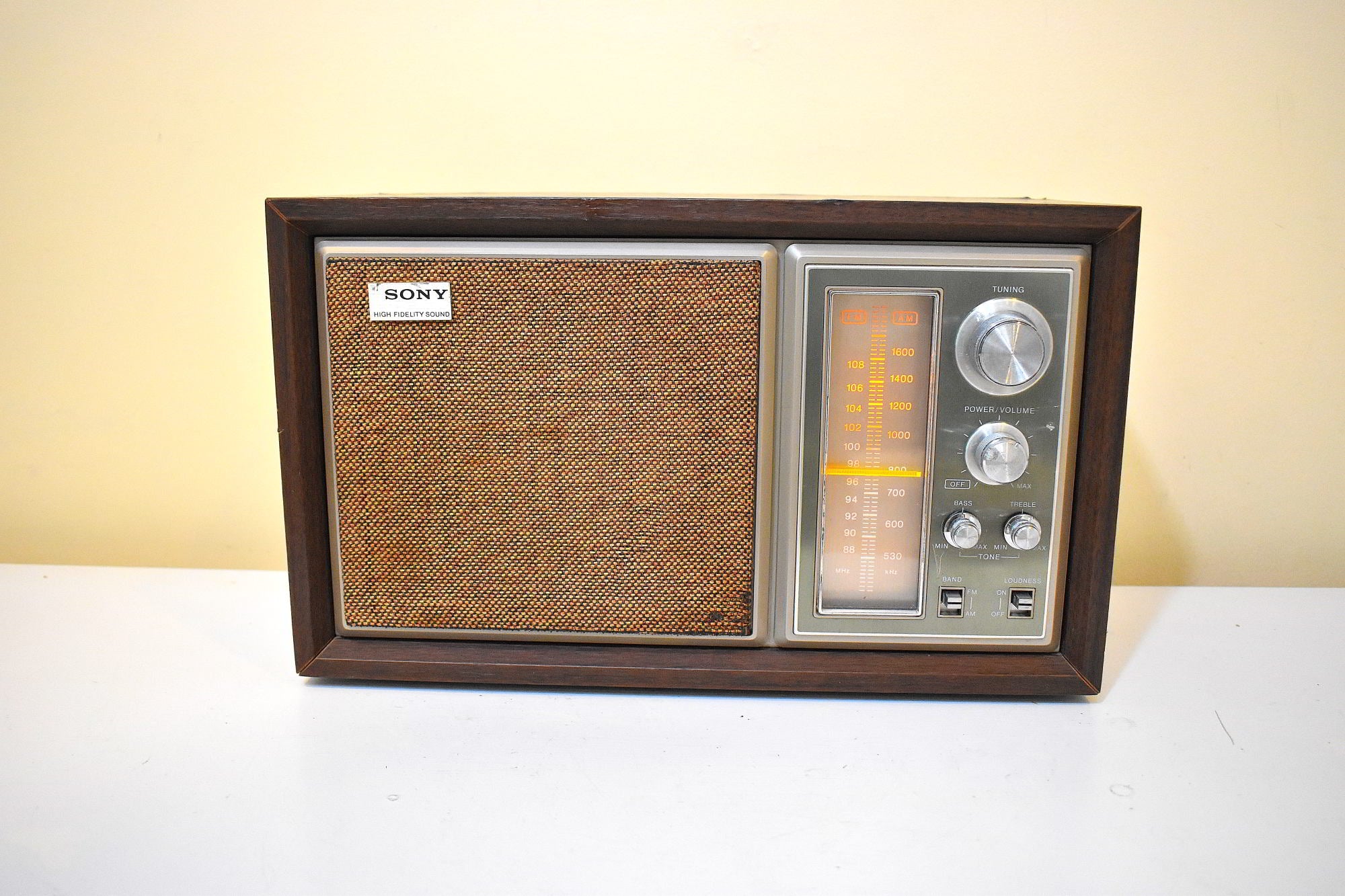 説明: 一度聴けば、なぜソニーが 70 年代から 80 年代にかけて有力なエレクトロニクス輸入メーカーであったかがわかるでしょう。 1970 年代半ばから後半にかけてソニーによって製造されたソリッド ステート トランジスタ ラジオ。動作良好で物理的な状態も良好です。ウォールナット木目のカバーとつや消しアルミニウムのトリムを備えたモダンなスタイルのデザイン。