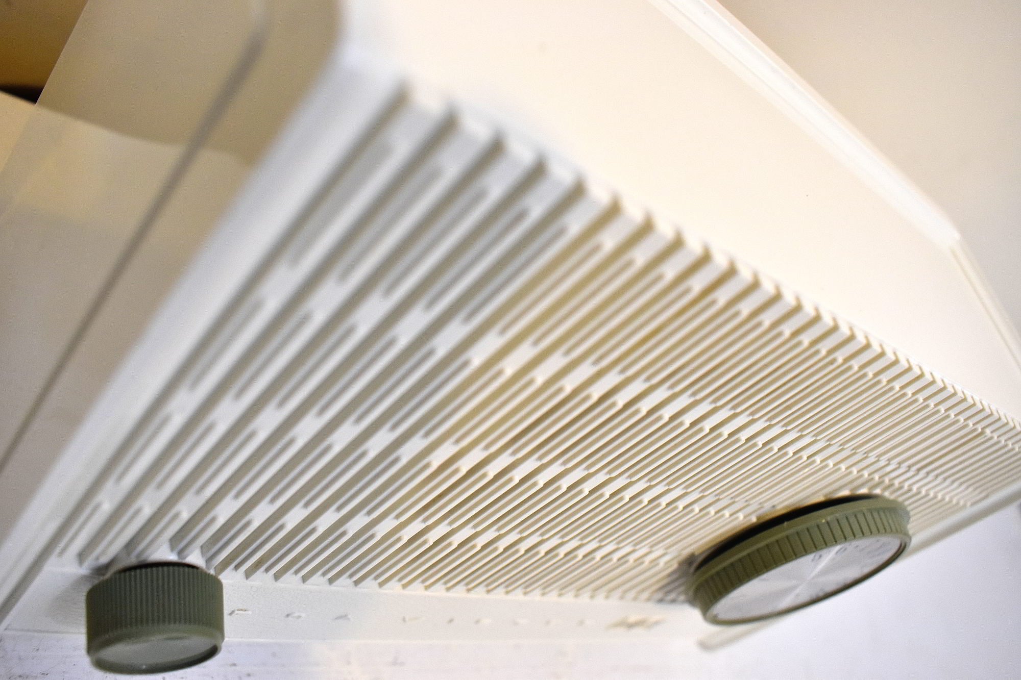 KNOBS: Original green gray color knobs are original, matching and securely attached. The tuning dial works fine no slipping no sticky spots. Silver brushed aluminum metal center caps are shiny and excellent condition.