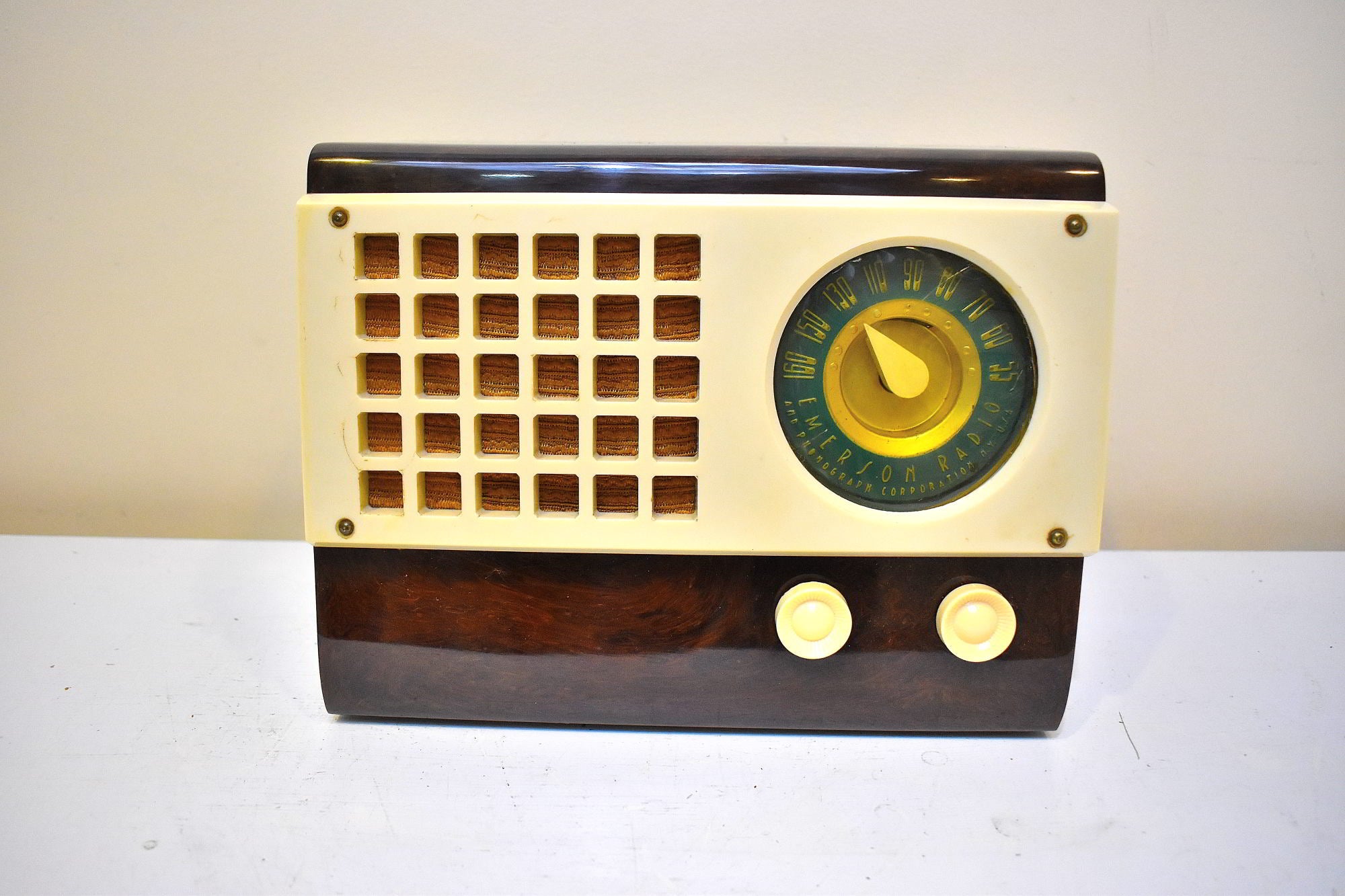 DESCRIPTION: Tabletop vacuum tube AM vacuum tube radio manufactured by Emerson in 1947 in excellent working and physical condition. If you have a hankering for Catalin but don't want to spend too much, Emerson 520 is probably the most affordable Catalin you can buy.