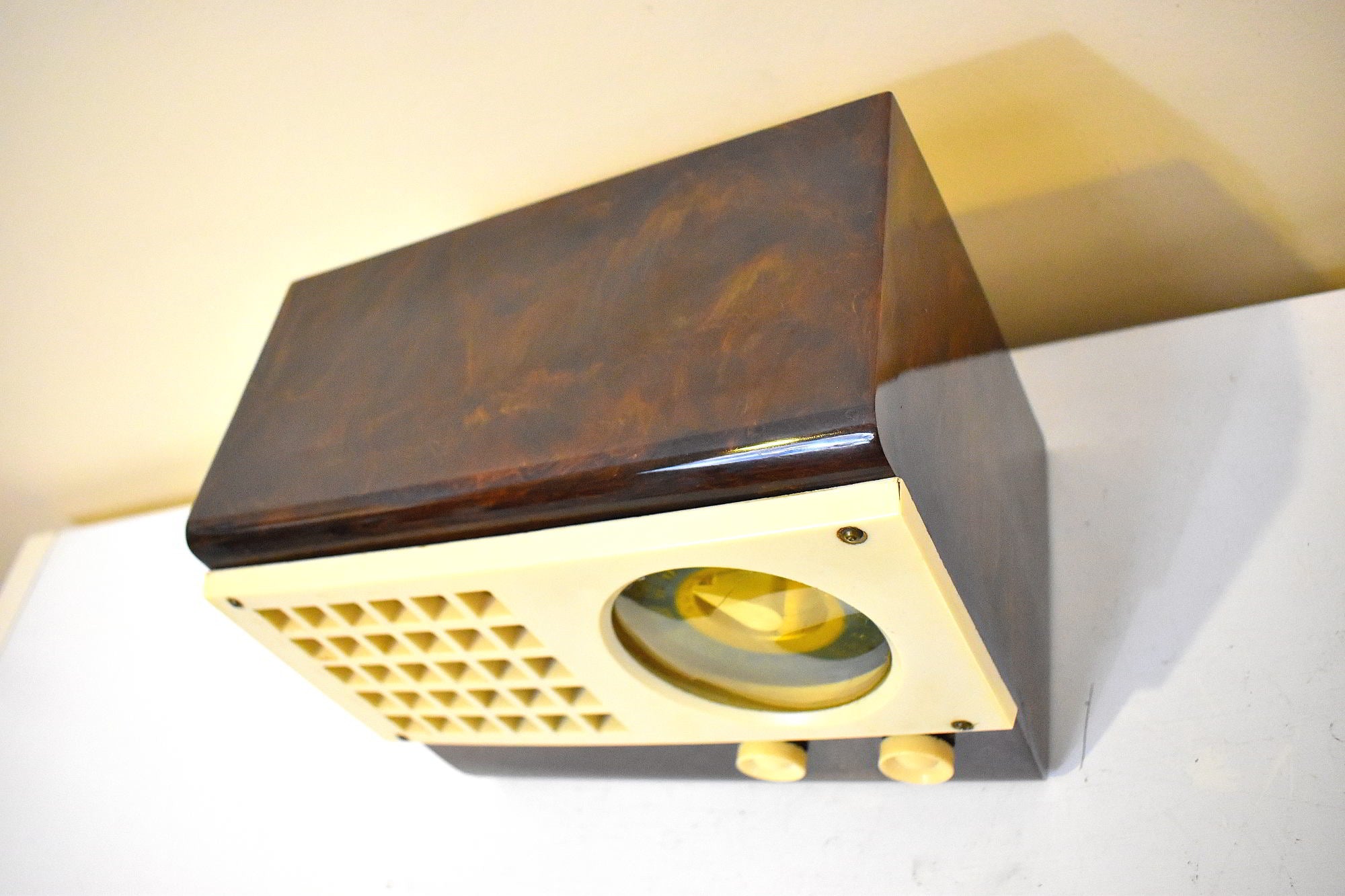 CABINET CONDITION: Cabinet is original factory molded butterscotch and gold swirl Catalin cabinet. No cracks, chips or major scratches or missing pieces. Not repainted, no touch up not over sprayed. White molded plastic front decorative grill is in excellent condition, no cracks, no chips, and securely attached. Original grill cloth is in excellent condition with no rips, no loose edges, no water stains.