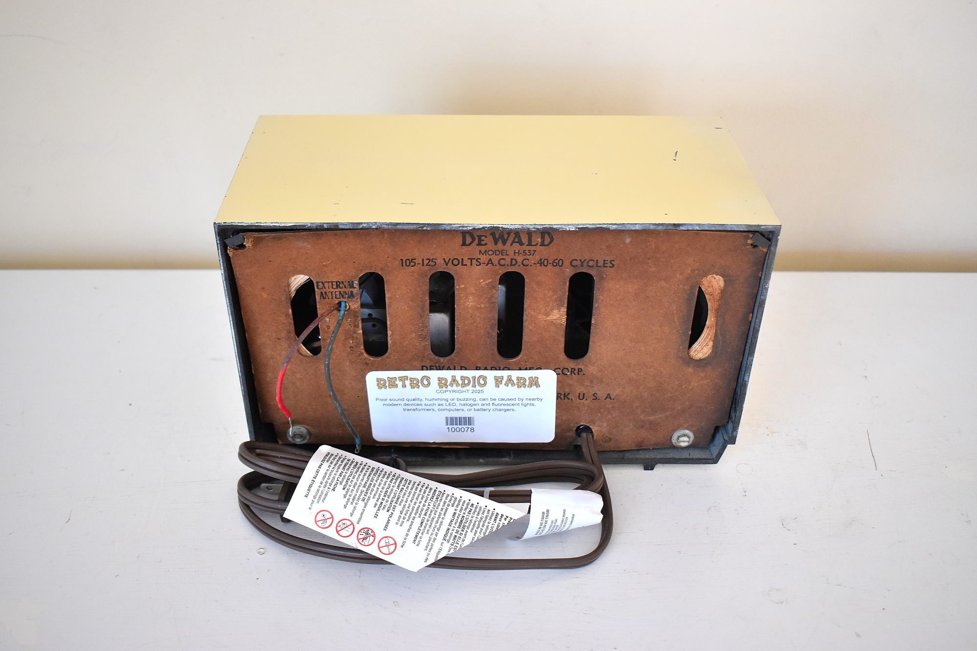 説明: ゼニスのデザインの中でも人気の高いフクロウアイです。 1951 年にゼニスによって製造された卓上真空管 AM ラジオ。動作および物理的状態は良好です。ひび割れ、欠け、大きな傷のない美しいベークライト製ラジオです。オリジナルの工場出荷時の茶色の渦巻き模様の色は再塗装されておらず、タッチアップやオーバースプレーもありません。このラジオは60年以上前のものです。フロントのゴールドメタルフェイシアチューニングとクロックサラウンドトリムは、多少の変色、へこみ、へこみはあるものの、非常に良好な状態です。文字盤の文字盤にインクの欠落、汚れ、擦れなどはありません。チューニングダイヤルは滑らず、ベタつきもなく正常に機能します。 3 つの小さな茶色の一致する時計ノブはすべて存在し、しっかりと取り付けられています。ボリュームノブはオリジナルです。チューニングノブは交換品です。新品の交換用電源ケーブルと安全極性プラグは、破損や露出したワイヤー、脆さなどなく、優れた動作状態にあります。時計が動作し、正確な時間を保ちます。時計モーターは静かで、ハム音、ブーン音、カチカチ音はありません。正確な設定時刻に警報ブザーとラジオアラームが鳴ります。スリープタイマーが機能します。ダイヤルライトはありません。 1つでは設計されていませんが、追加料金で追加できます。チューブは正常に動作しています。大きなハムノイズや周囲に広がるハムノイズはありません。ステーション間には、大きな静電気や広範囲に広がる静電気はありません。セットは工場出荷時の仕様に従って調整されています。ラジオは徹底的に清掃され、検査されています。オリジナルのバッキングボードがまだ残っており、T ピンとネジだけで固定されているのは驚くべきことです。疲れた角は強化され、取り付けが良くなりました。底部の工場出荷時のラベルが欠落していません。すべての配線は、ブリッジ接続や弱いはんだ接続がないか徹底的にチェックされています。禁煙、成熟した、清潔なプロフェッショナルな環境から生まれました。