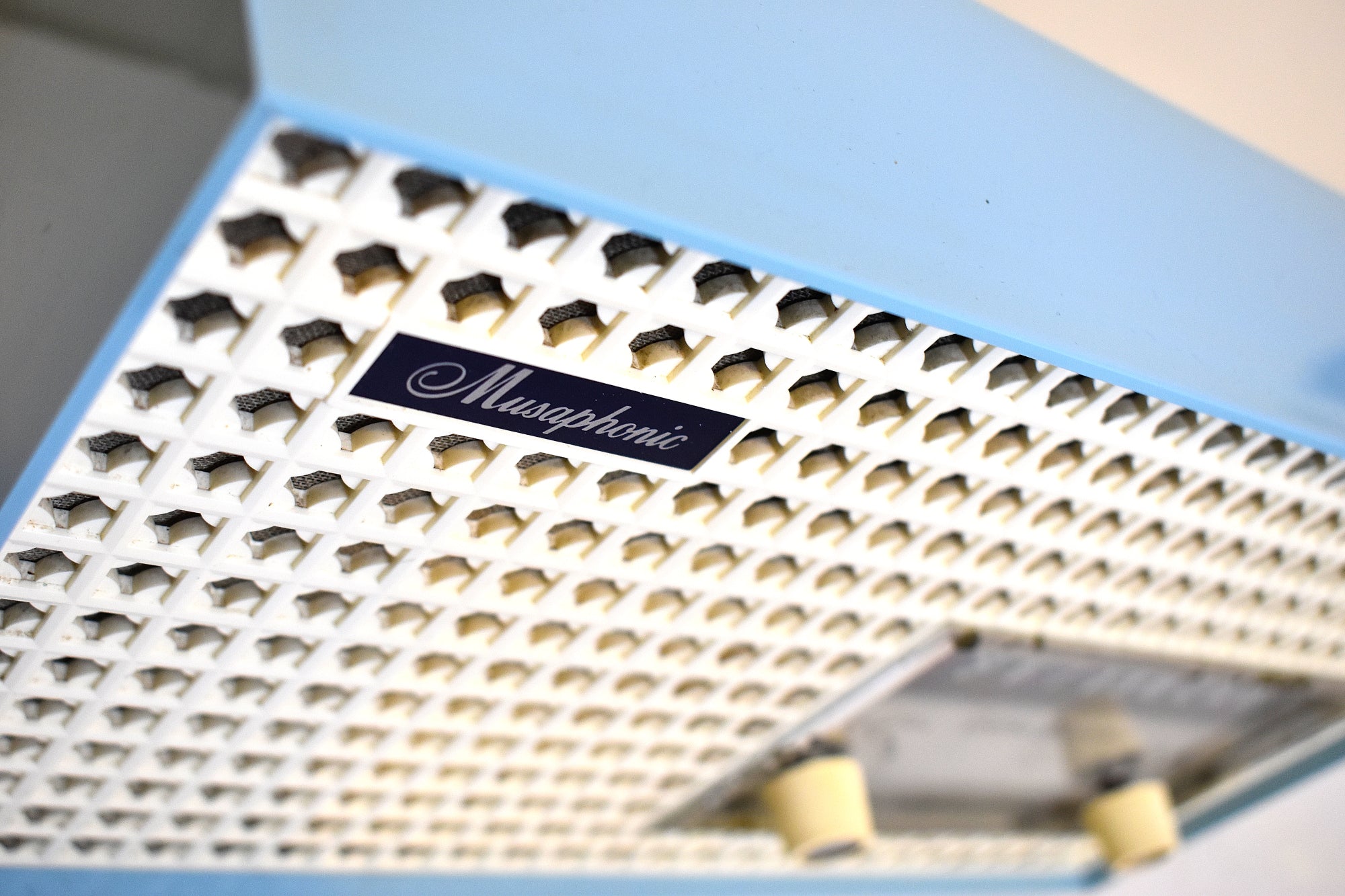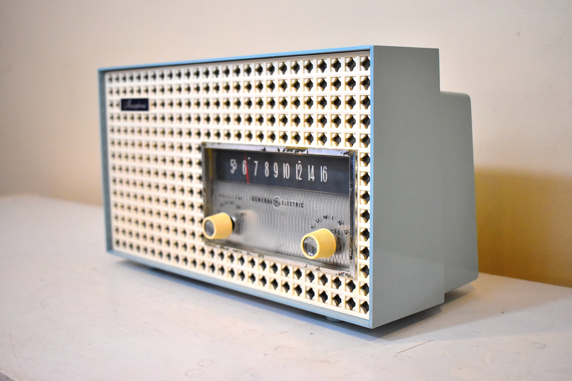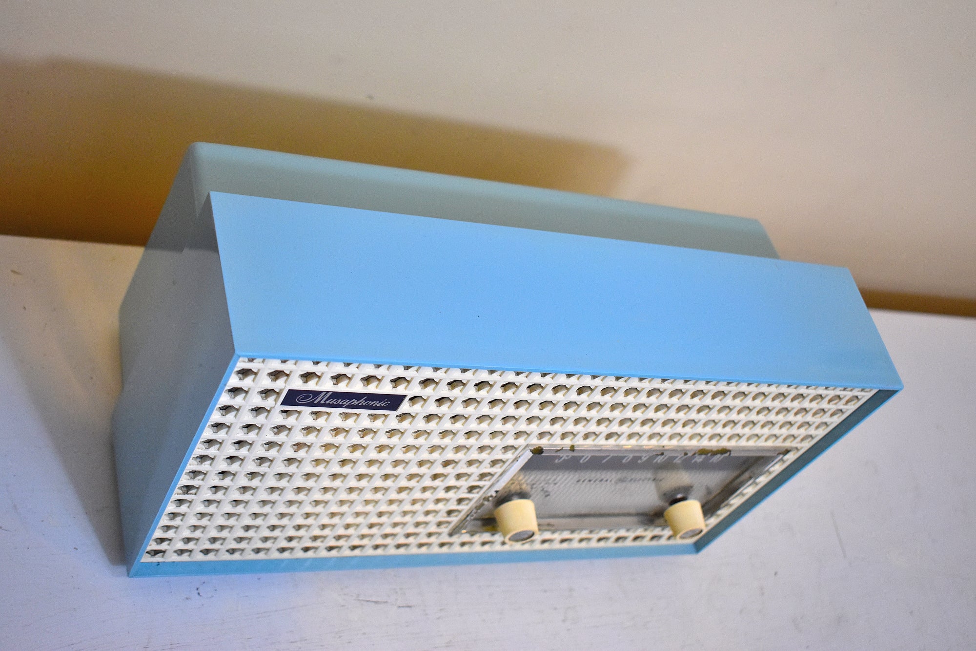 CABINET CONDITION: Cabinet is original factory molded pastel cornflower blue and ivory plastic. No cracks, chips, or major scratches on top, front, back or sides. No heat cracks or heat warping on top. Front ivory molded pattern grill is in excellent condition with no cracks or chips. All original factory colors. Not repainted, no touch up, not over sprayed. Front tuning aluminum bezel is clean shiny no dents no dings no pitting some chrome some paint rub off. Front clear tuning window is in excellent condition with no cracks, no faded numbers.