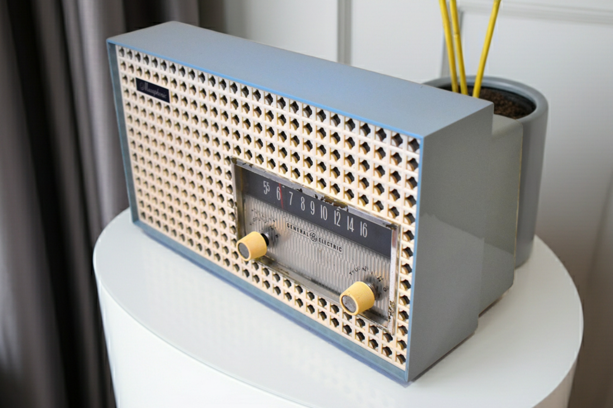 DESCRIPTION: Cool mid-century styling featuring front clover leaf pattern grill. Reminiscent of mid century breezeway blocks used in architectural designs of the period. This tabletop vacuum tube AM radio was manufactured by General Electric in 1960 in excellent physical and working condition.