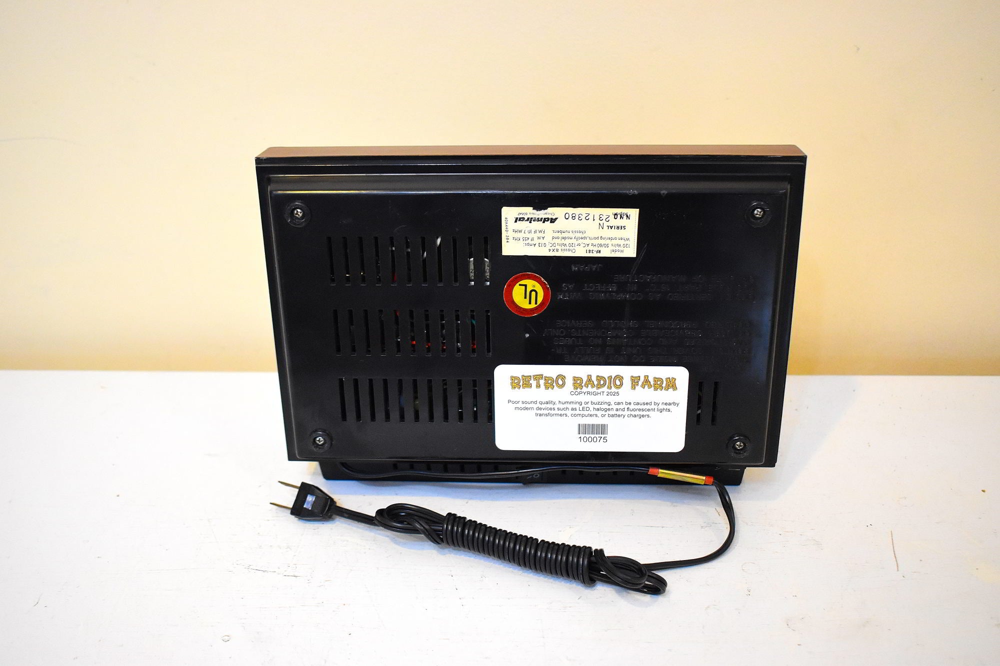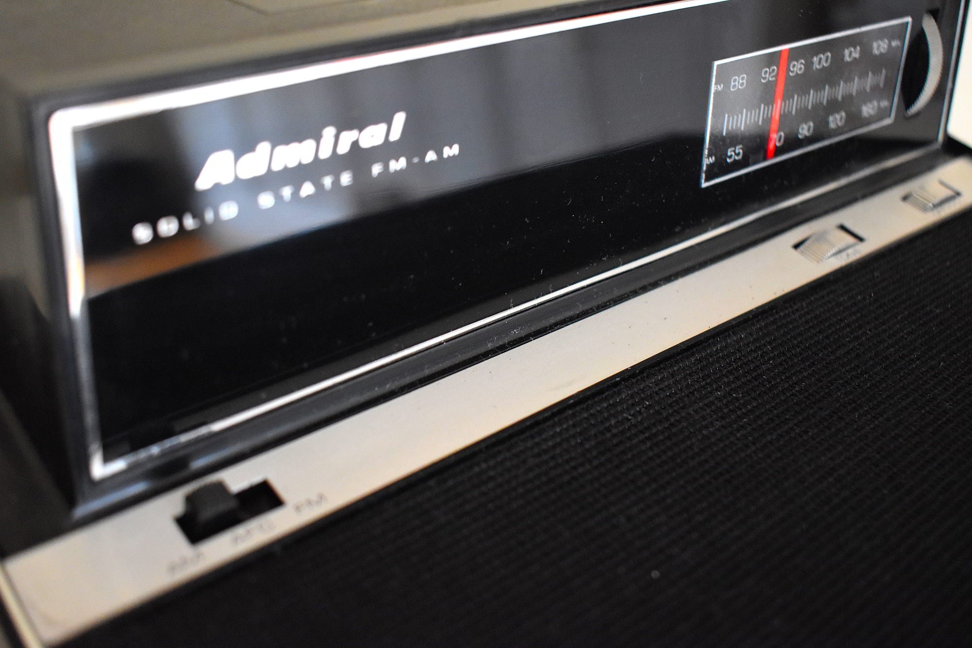 CABINET CONDITION: Cabinet is original black molded plastic cabinet with factory painted simulated wood grain features. No cracks, chips, or major scratches on the top, bottom, back and sides.  Original black fabric grill cloth is in excellent condition with no rips, no holes, no stains. Function lettering and numbering is not worn off. Clear tuning window is in excellent condition with no scratches or cracks. Tuning back panel is in excellent condition with no blemishes, flaking paint, clear readable printing.
